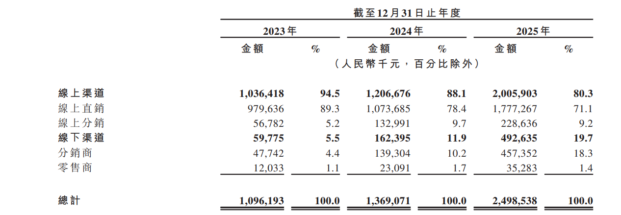 不过,从线上走向线下,仍需时间的积累。按渠道划分,2023年至2025年,该公司通过线上渠道录得收入分别约10.36亿元、12.07亿元和20.06亿元,占总收入的比重分别为94.5%、88.1%及80.3%。