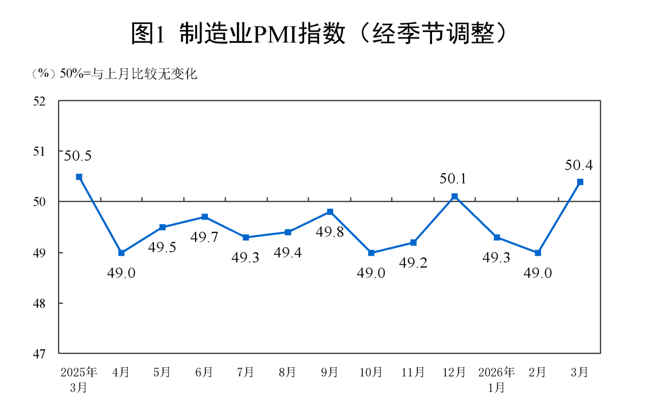 3月31日,国家统计局公布的数据表明,3月份,制造业采购经理指数(PMI)、非制造业商务活动指数和综合PMI产出指数均重返扩张区间,分别为50.4%、50.1%和50.5%,比上月上升1.4个、0.6个和1.0个百分点,我国经济景气水平回升。