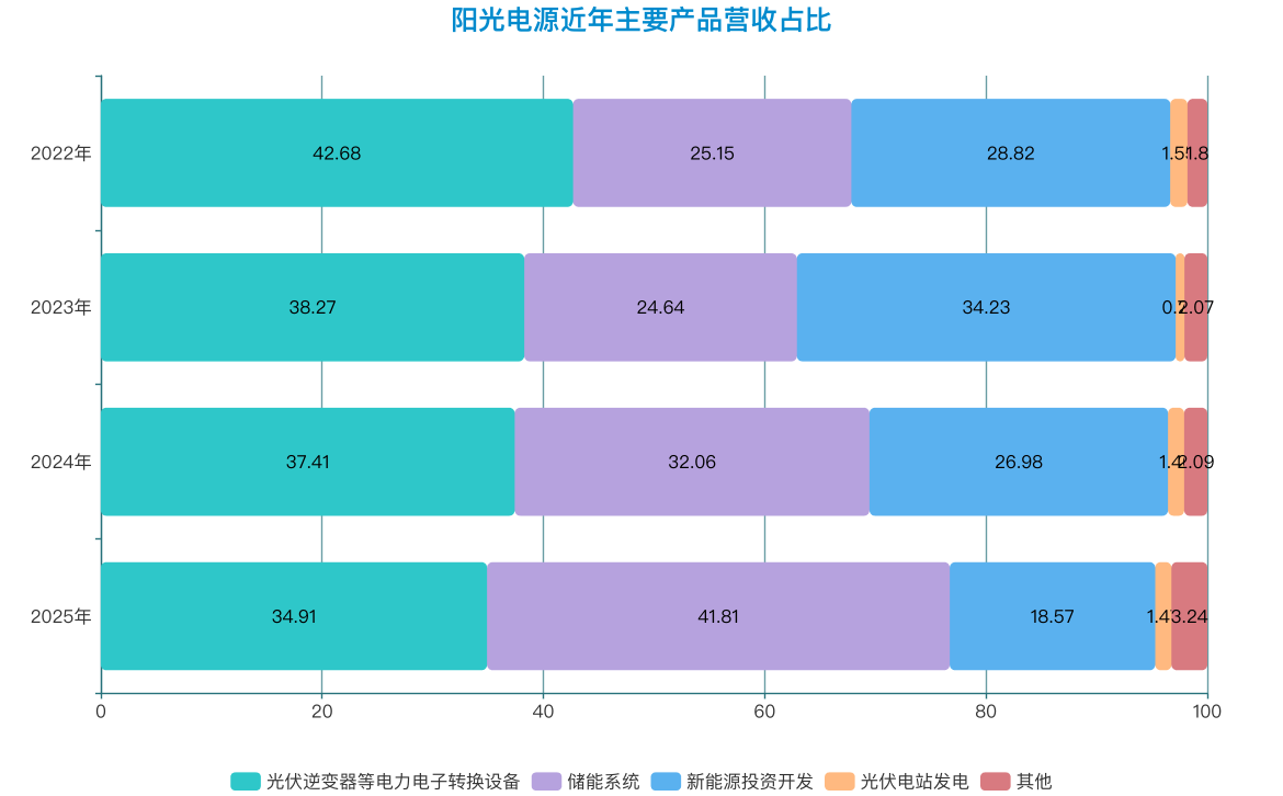 2025年,阳光电源储能系统的营收占比首次超越光伏逆变器等电力电子转换设备,意味着公司的营收支柱已悄然完成了一次交接棒。