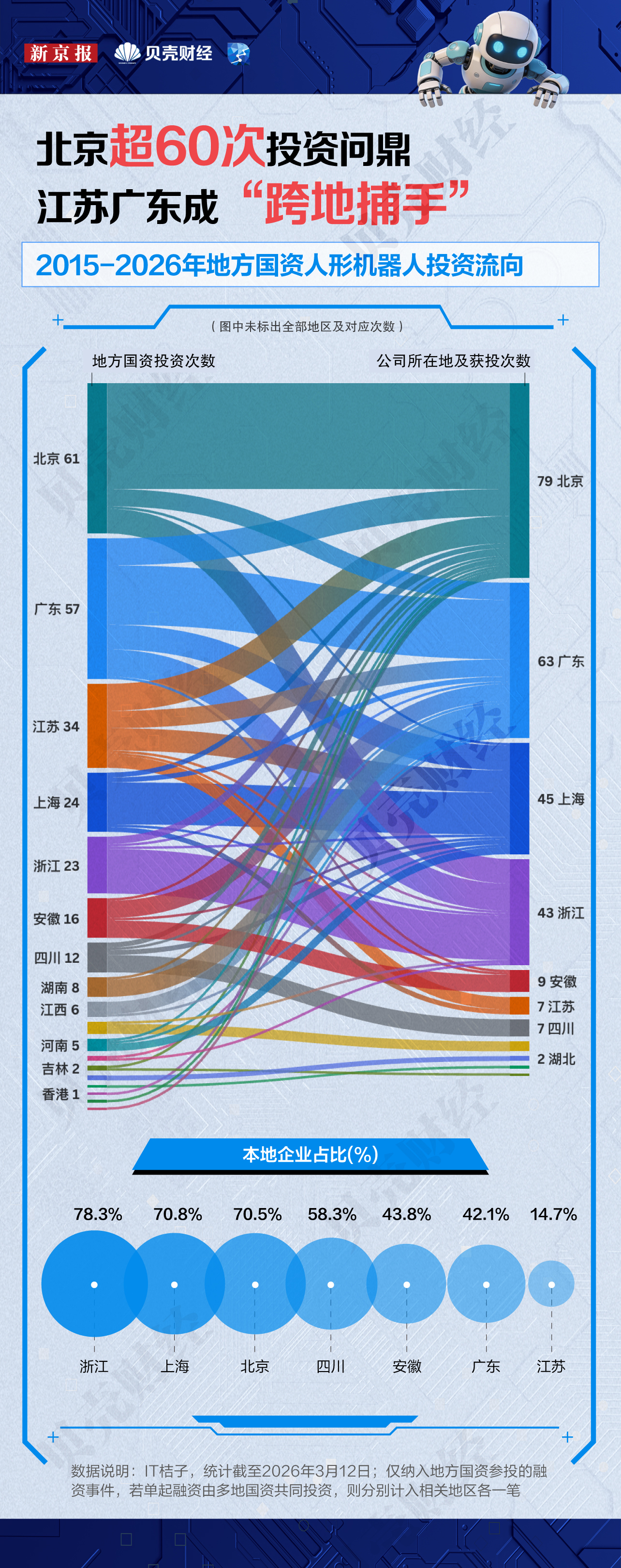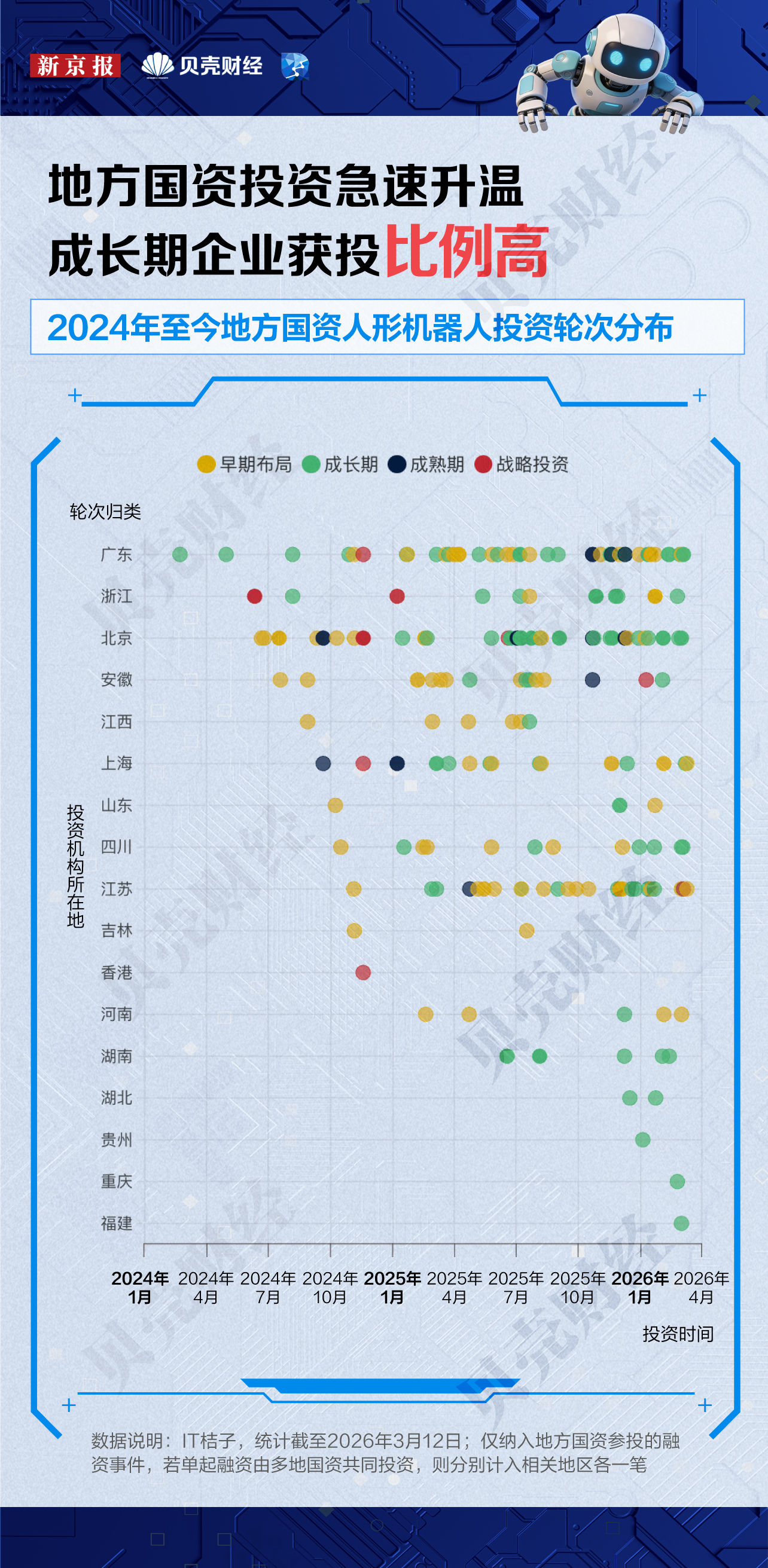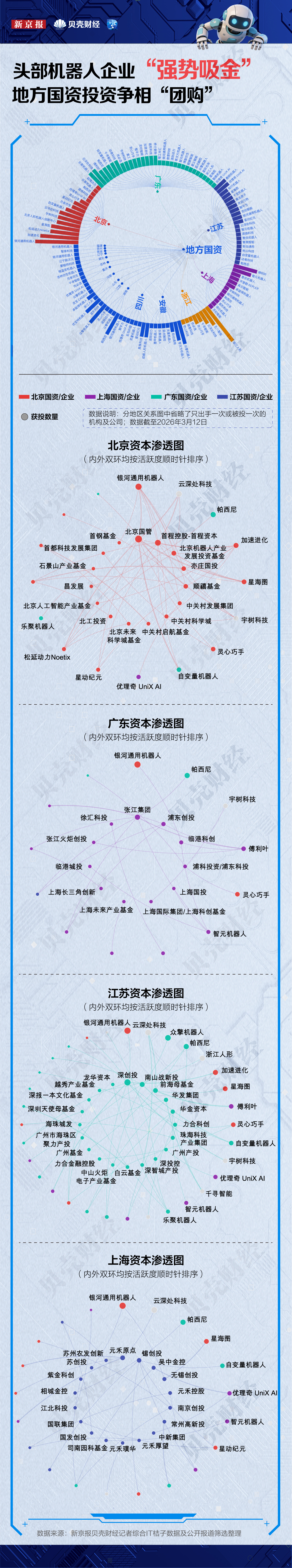 新京报贝壳财经记者统计发现,银河通用、浙江人形、云深处科技等项目被地方国资投资的次数居于前列。其中,银河通用共被15家地方国资机构投资16次,云深处科技获北京、广东、江苏、浙江等多地资本持续跟进,投资节奏贯穿多个轮次。