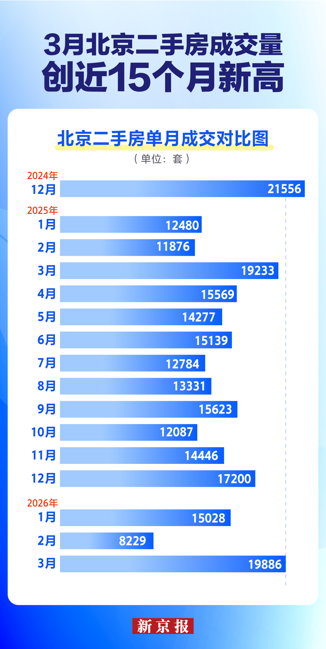 3月北京二手房近2万套的成交量创下了15个月的单月成交量新高。根据北京市住建委的网签数据统计,3月二手住宅网签量是19886套,环比增长144.6%,同比增长3.4%。这是继2025年3月之后,北京二手房市场再度重回接近2万套的规模。