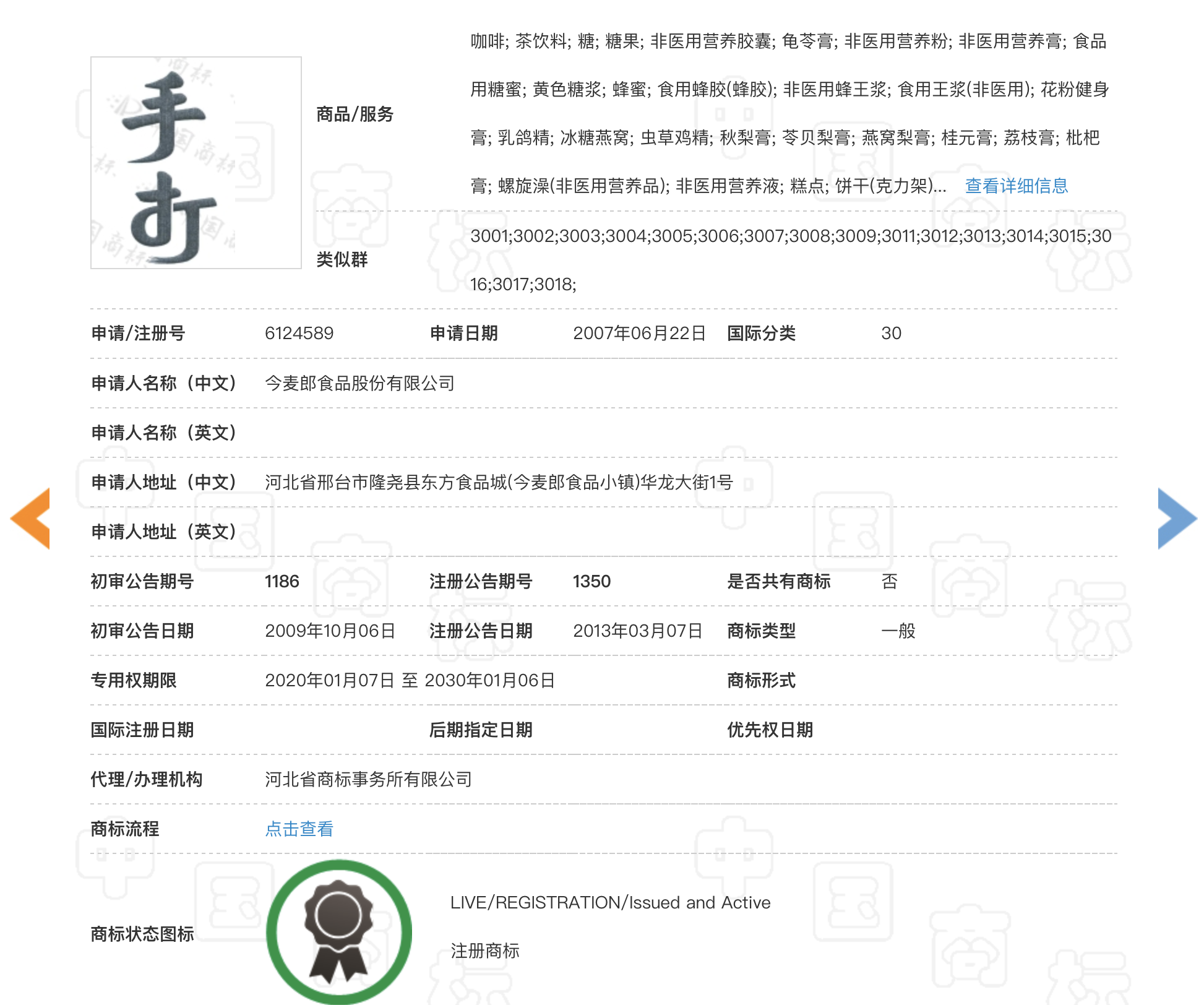 新京报记者查询中国商标网发现,今麦郎已申请注册25件“手打”相关商标,有2件处于等待实质审查阶段,1件无效,1件申请撤回,其余已注册成功。上述涉事“手打挂面”所用“手打”商标高度近似第6124589号商标,专用权期限为2020年1月7日至2030年1月6日。