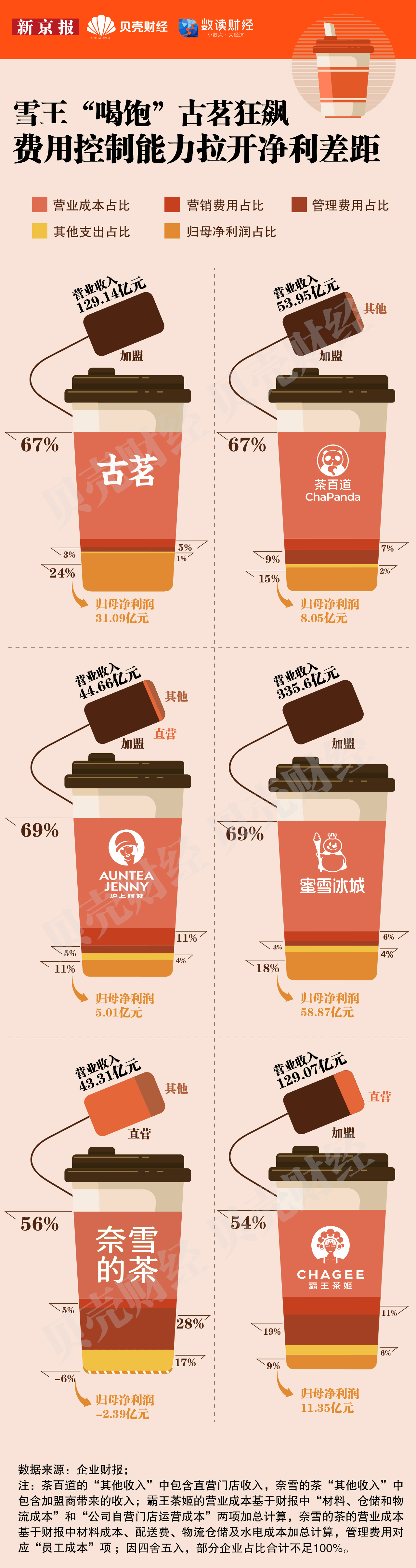 相比之下,古茗、蜜雪集团、沪上阿姨的管理费用率低至个位数,加盟模式的轻资产优势突出。