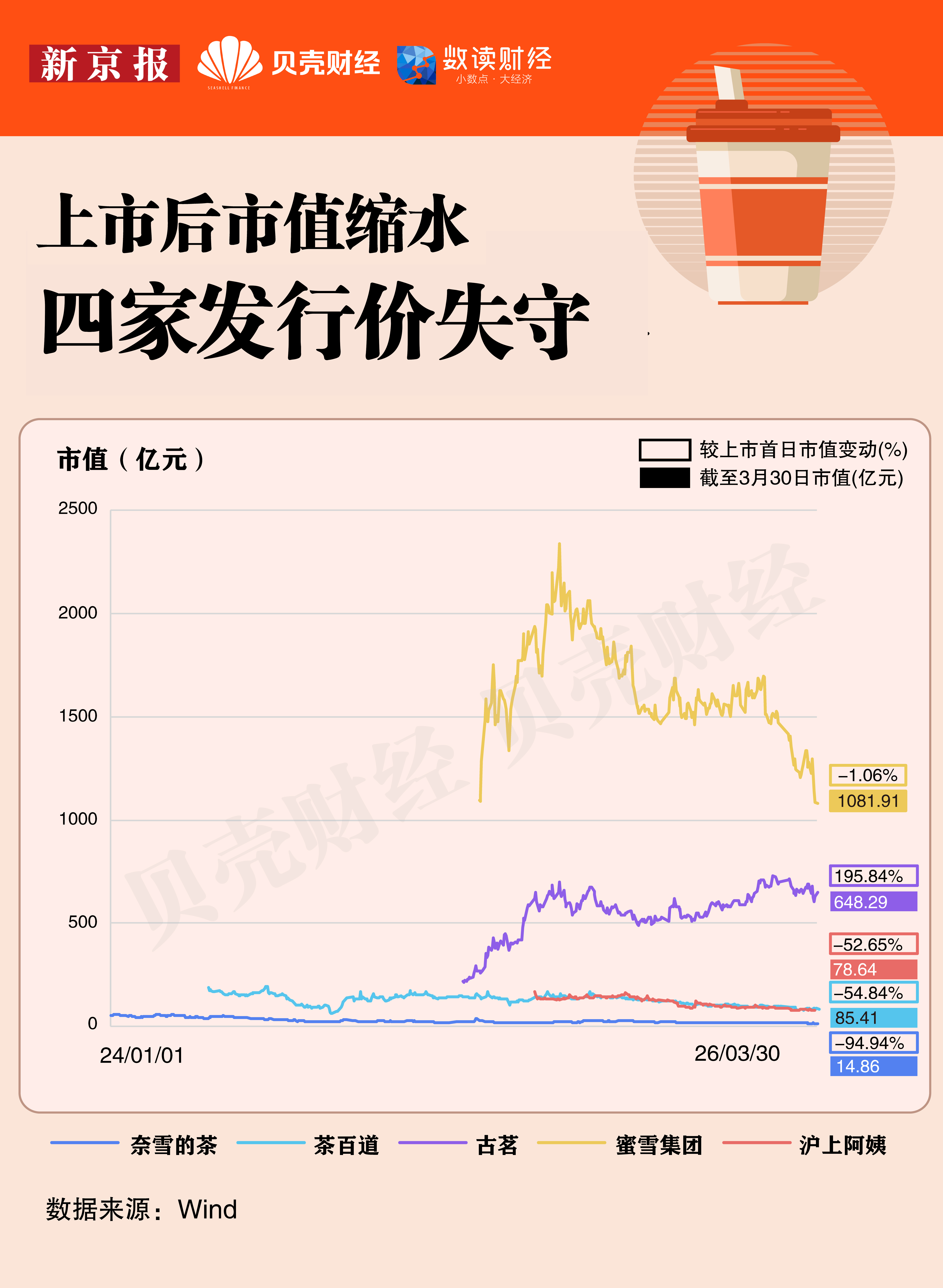新京报贝壳财经记者梳理数据发现,截至2026年3月30日,五家港股上市新茶饮公司中,仅古茗一家较上市首日实现增长,增幅达到近2倍。其余四家均较上市首日出现下滑,奈雪的茶市值降幅达到95%。茶百道、沪上阿姨也分别下跌超五成,蜜雪集团则基本守住发行价。