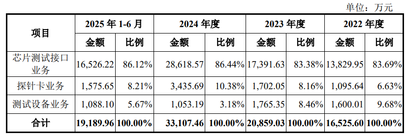 招股书显示,2022年-2024年及2025年上半年,韬盛科技芯片测试接口业务收入均超八成,探针卡业务收入占比6%-11%,测试设备业务收入占比3%-10%。