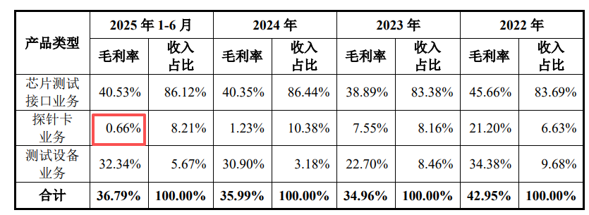 从毛利率上看,芯片测试接口业务毛利率在2022年、2024年及2025年上半年均超40%,而探针卡业务毛利率逐年收窄,2022年-2024年及2025年上半年,毛利率分别为21.20%、7.55% 、1.23%、0.66%。