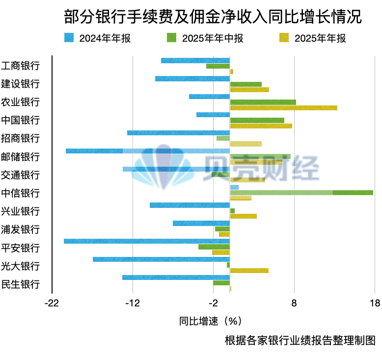 根据各家银行的业绩报告,在已发布2025年年报的22家银行中,有13家银行手续费及佣金收入同比正增长,而去年年中时仅8家银行为正增长。与此同时,去年年末的同比涨幅高于年中。