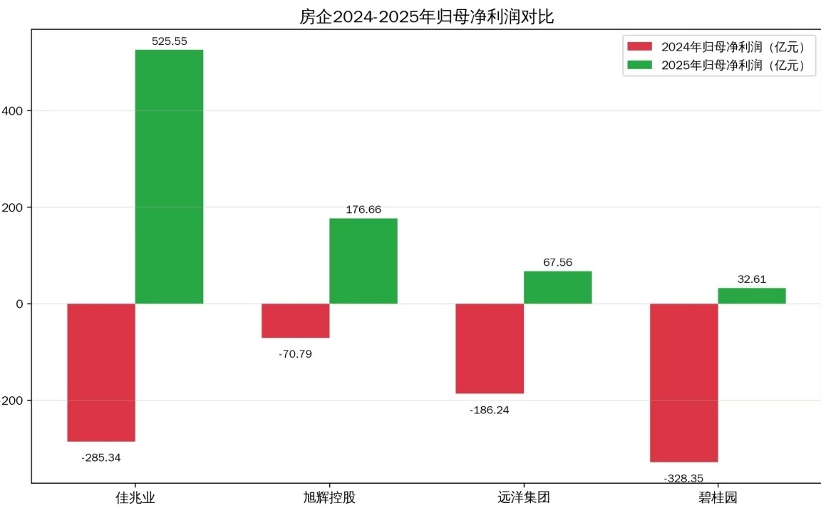 佳兆业、旭辉控股也相继披露“利好”,2025年全年归母净利润分别录得525.55亿元和176.66亿元,同比分别增长284.19% 、349.66%。仅这四家房企,2025年合计归母净利润为802.38亿元,而在2024年则是合计亏损870.72亿元。