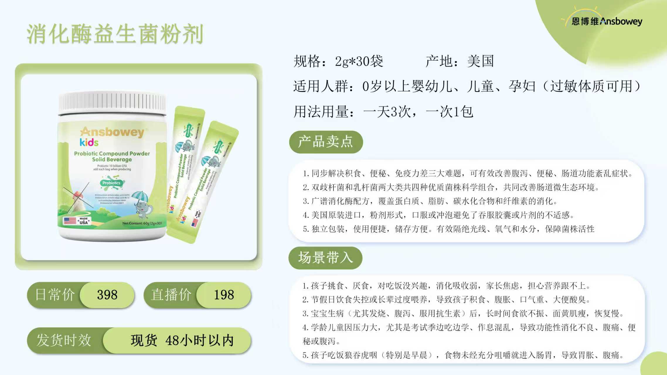 据销售人员提供的产品资料,这款菌酶粉全称为“恩博维复配酶益生菌复合粉固体饮料”,“适用人群”为0岁以上婴幼儿、儿童、孕妇(过敏体质可用),“产品卖点”为同步解决积食、便秘、免疫力三大难题等。该粉剂日常价为398元/罐,直播价可做到198元/罐。