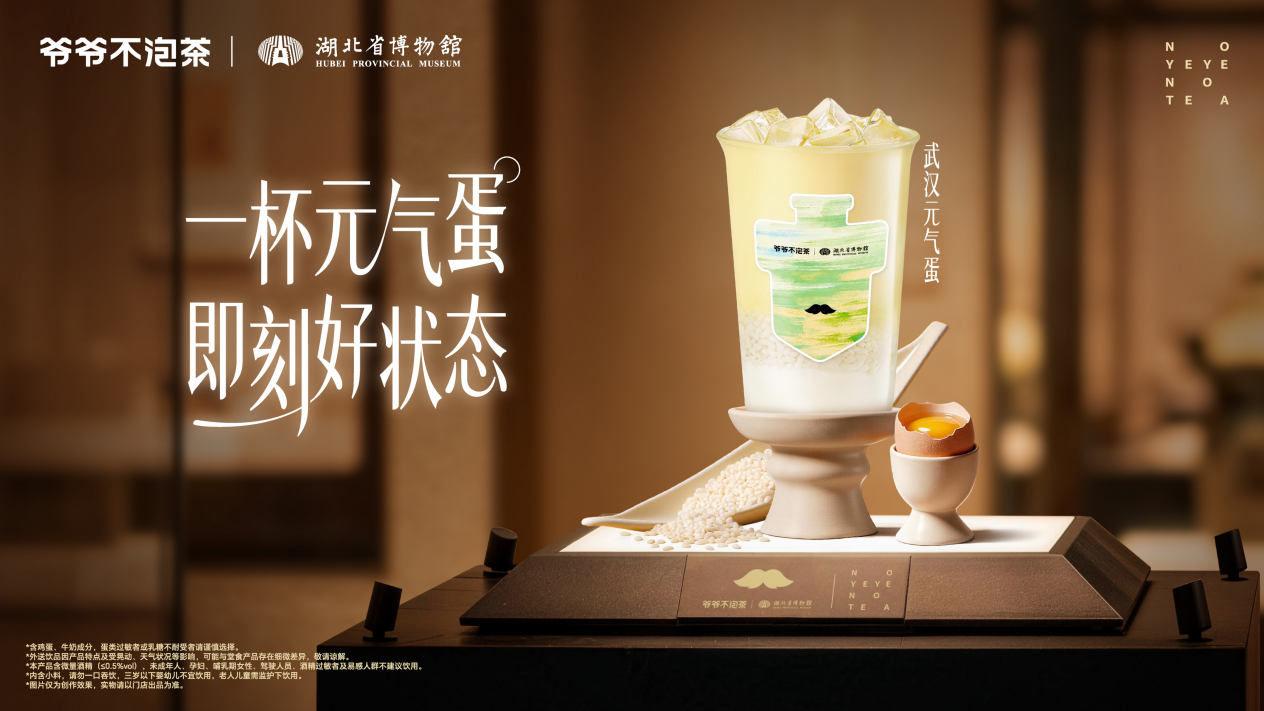 此次爷爷不泡茶与湖北省博物馆携手,联合推出新品“武汉元气蛋”和联名周边,让消费者可以把千年楚韵喝进日常。湖北省博物馆以守护、活化荆楚文脉为使命,致力于让传统文化可感可触、可亲可玩;爷爷不泡茶深耕荆楚风味、立足本土基因,坚持用一杯杯茶饮讲好湖北故事,让地域文化以年轻态、生活化方式破圈。双方基于共同的文化传播目标达成合作,以文化焕新与消费创新为方向,推动博物馆文化与市井消费场景深度融合。