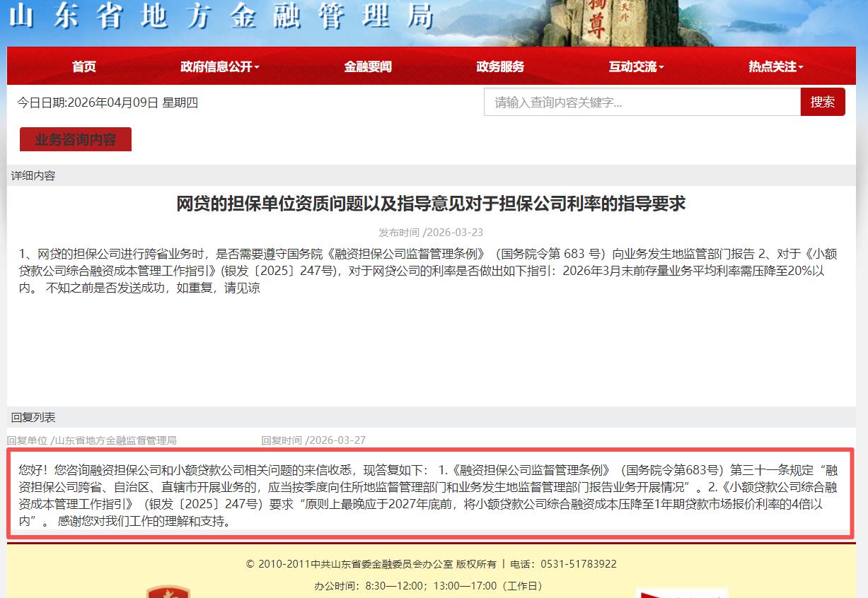 山东省地方金融管理局在回复中表示:《小额贷款公司综合融资成本管理工作指引》(银发〔2025〕247号)要求,原则上最晚应于2027年底前,将小贷公司综合融资成本压降至1年期贷款市场报价利率(即LPR)的4倍以内。