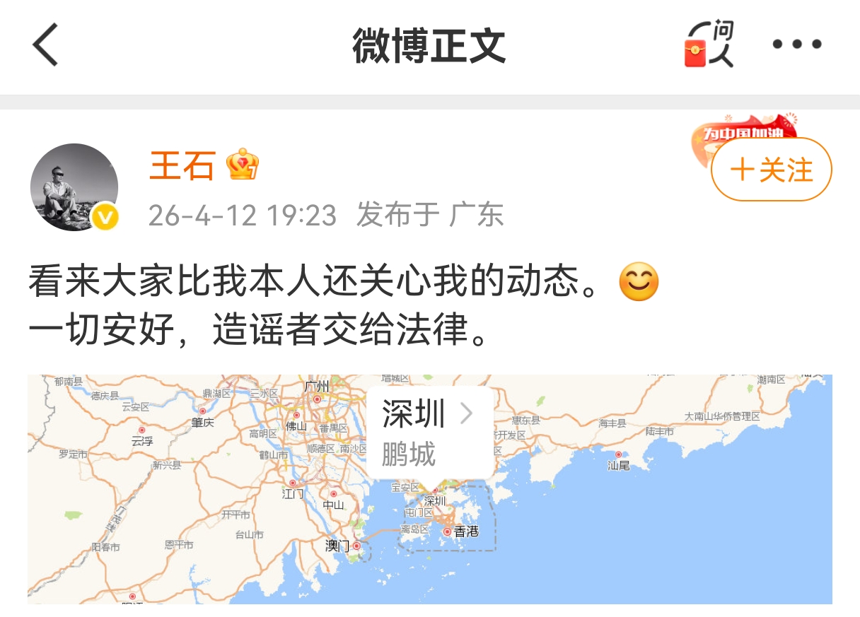 对此,王石、田朴珺均发消息进行回应。王石称:“看来大家比我本人还关心我的动态。一切安好,造谣者交给法律。”