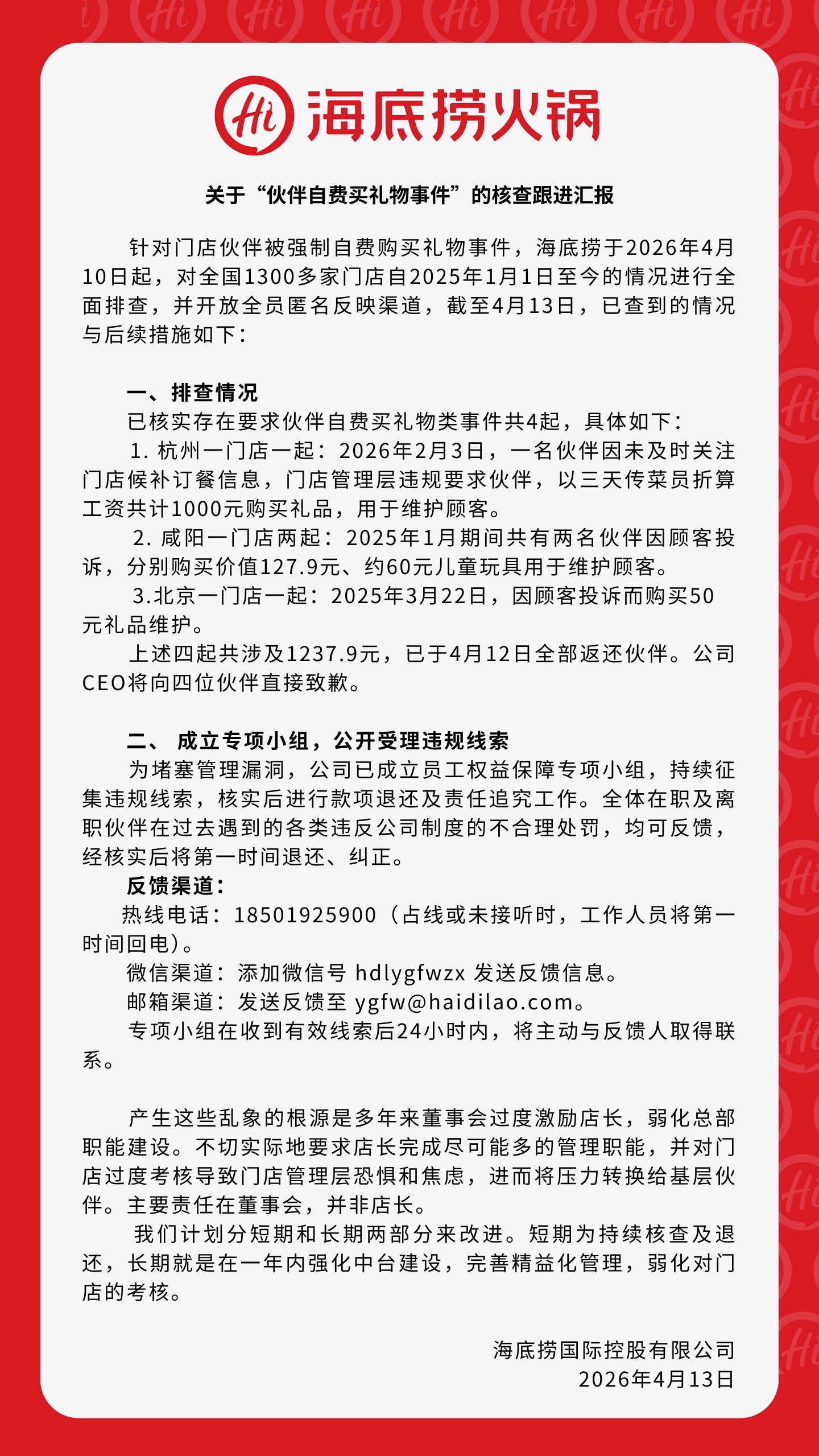 汇报称,海底捞于2026年4月10日起,对全国1300多家门店自2025年1月1日至今的情况进行全面排查,并开放全员匿名反映渠道,截至4月13日,排查情况已核实存在要求伙伴自费买礼物类事件共4起。