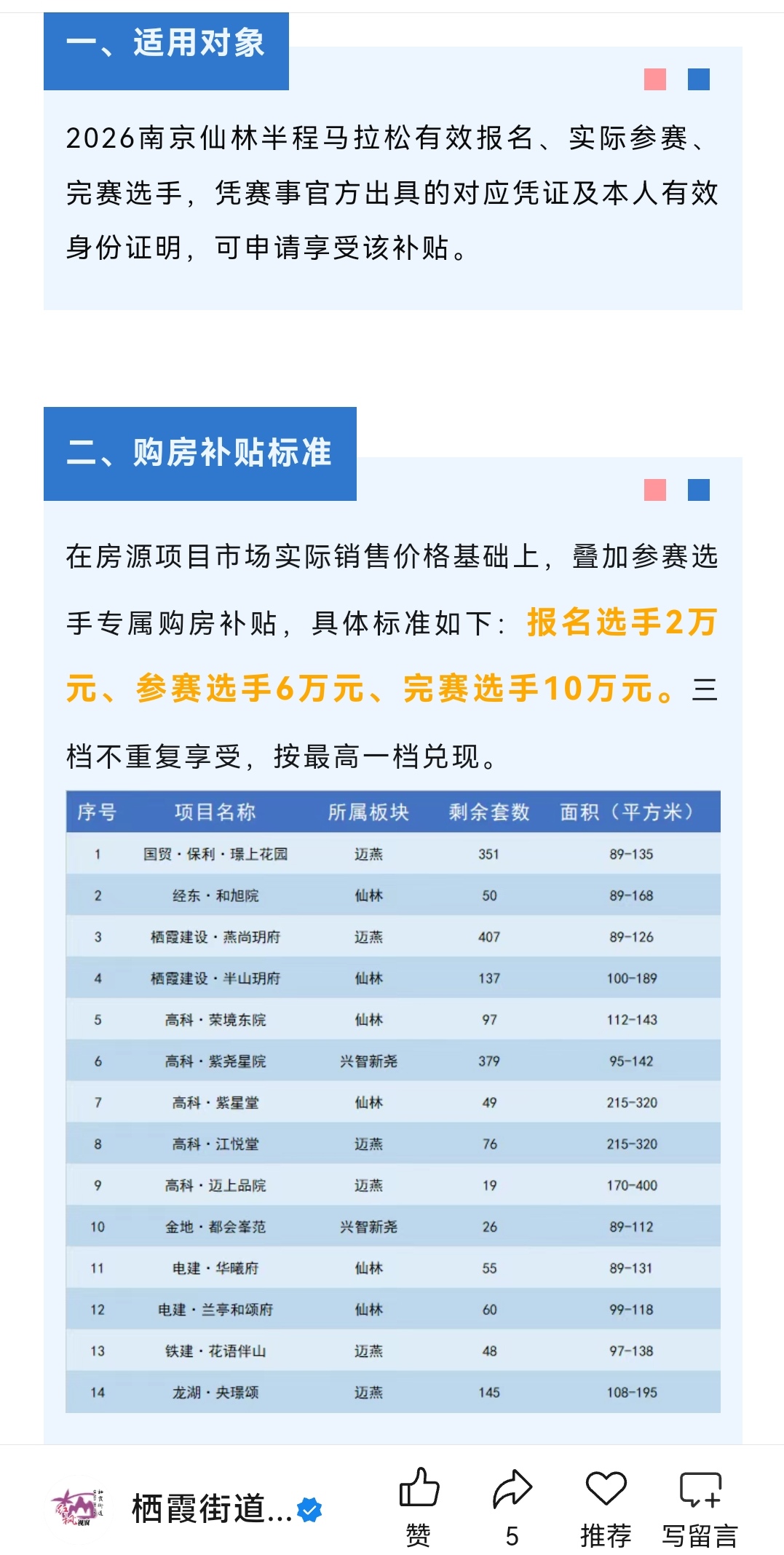 在此次马拉松开跑前的4月8日,南京市栖霞区人民政府栖霞办事处的微信公众号发文,公开了此次参与活动的房源库,共14个项目,这些项目均位于迈燕、仙林和兴智新尧三大板块。不同项目剩余的套数不等,最高达到407套,最低的仅有19套。房源面积介于89—400平方米之间。