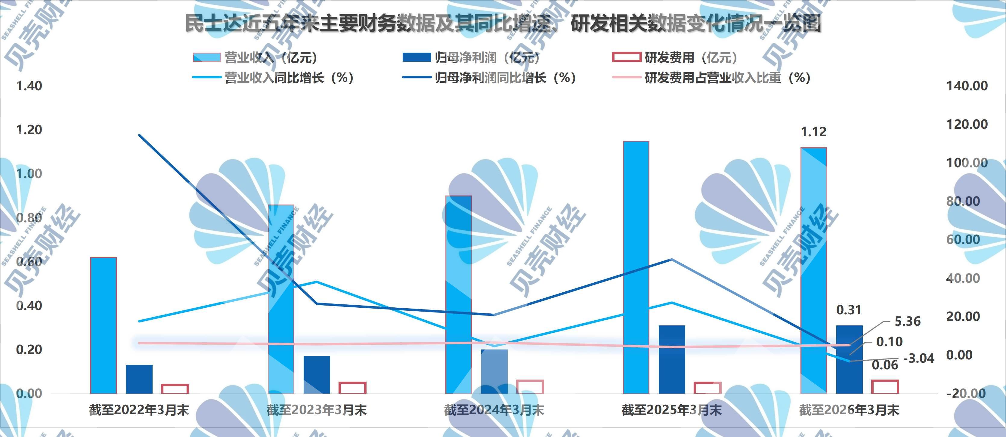 来自2026年一季报数据,民士达截至3月末实现营业收入约1.12亿元,同比下降3.04%;归母净利润3057.98万元,同比微增0.1%。但民士达保持了技术创新投入强度,报告期内,其研发费用同比增长13.48%至615.12万元,同时研发费用占营业收入的比重也由上年同期的4.35%升至5.36%。