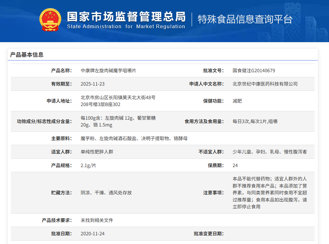 记者在国家市场监督管理总局特殊食品信息查询平台发现,搜索“国食健字G20140679”批号,显示暂无结果,“国食健注G20140679”可以搜到结果,其对应产品名称为“中康牌左旋肉碱魔芋咀嚼片”,申请人为北京世纪中康医药科技有限公司,保健功能为“减肥”,适宜人群为“单纯性肥胖人群”,主要原料包括“魔芋粉、左旋肉碱酒石酸盐、决明子提取物、铬酵母”。不过,上述批号有效期仅到2025年11月23日,已经过期。