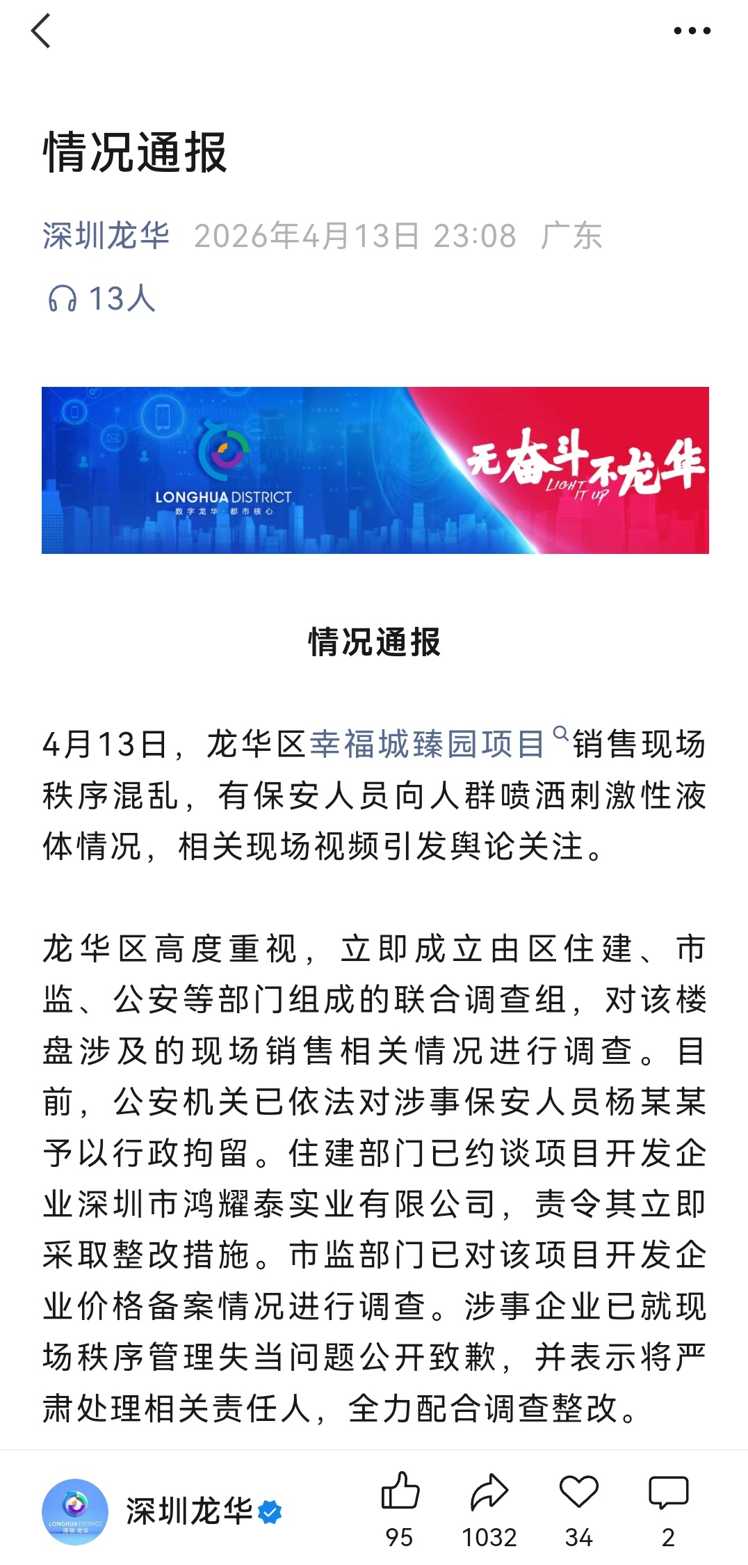 事件发生后,深圳龙华区相关政府部门迅速介入。4月13日晚间,深圳龙华区微信公众号“深圳龙华”发布消息称,龙华区已经成立由区住建、市监、公安等部门组成的联合调查组,对该楼盘涉及的现场销售相关情况进行调查。
