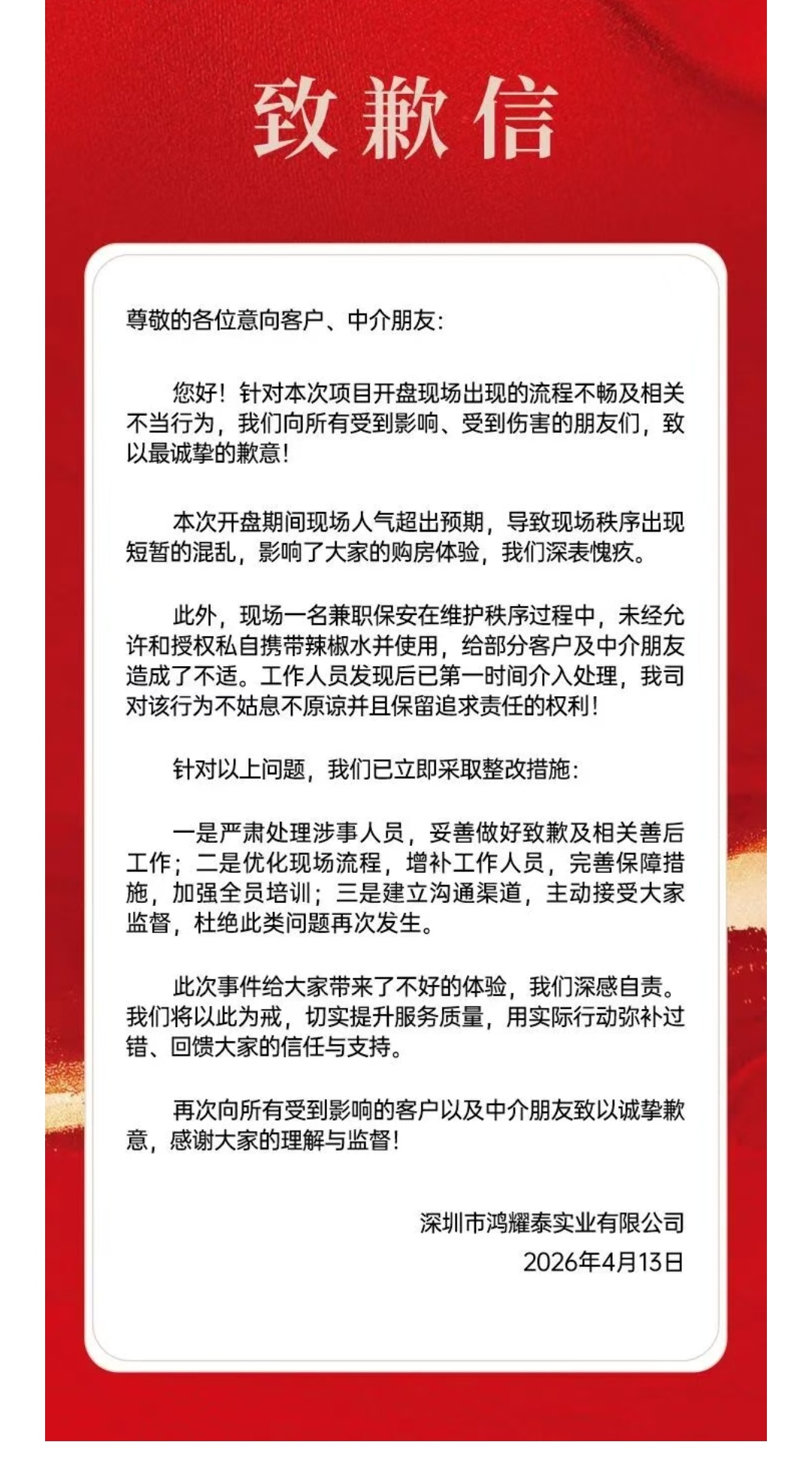 当日,开发商深圳市鸿耀泰实业有限公司发布致歉信称:“本次开盘期间现场人气超出预期,导致现场秩序出现短暂的混乱,影响了大家的购房体验,我们深表愧疚”。同时,该开发商也表示“严肃处理涉事人员,妥善做好致歉及相关善后工作”。