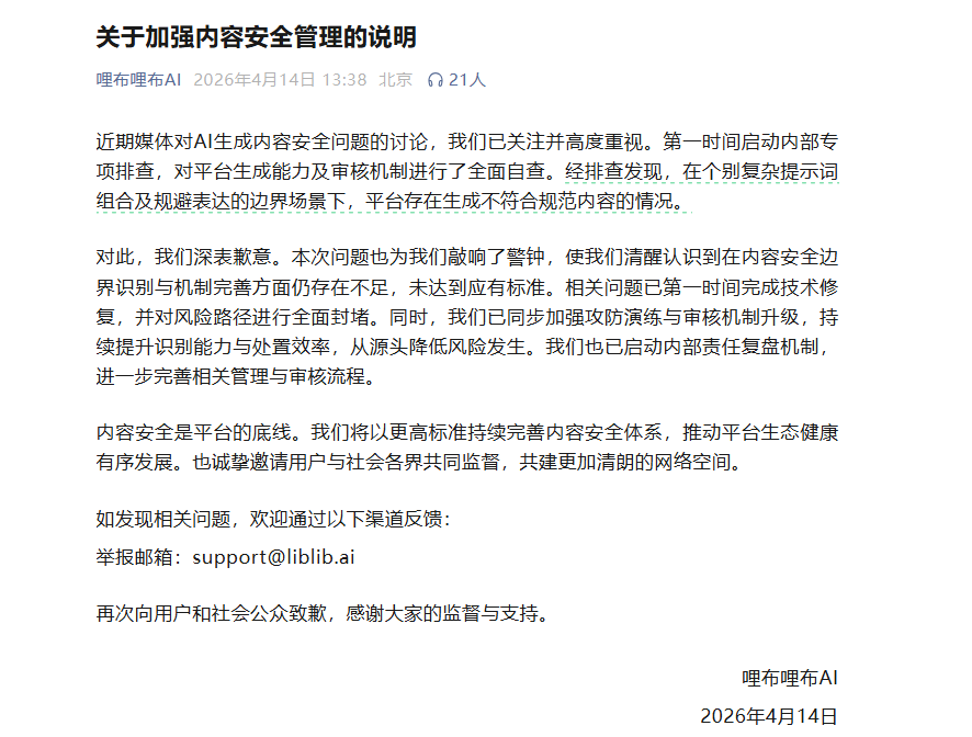 4月14日,哩布哩布AI发布《关于加强内容安全管理的说明》并道歉。