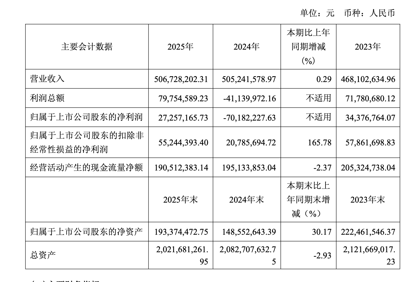 财务数据显示,公司全年实现营业收入约5.07亿元,与上年基本持平,同比增长0.29%;归母净利润约2725.72万元,较上年同期约7018.22万元的亏损实现扭亏;扣非后归母净利润约5524.44万元,同比增长165.78%。