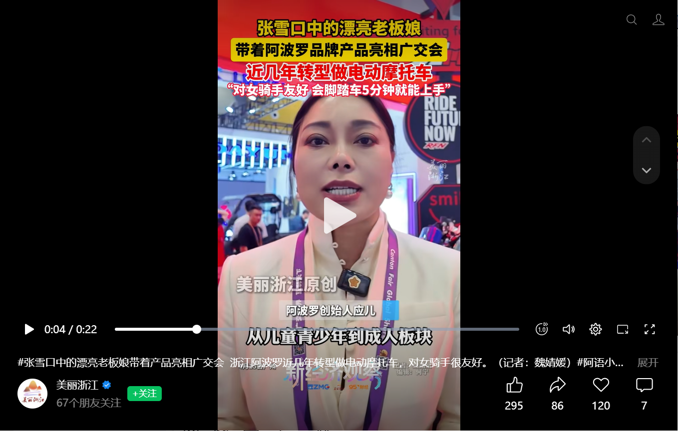 “浙江阿波罗老板娘特别漂亮”“祝阿波罗十周年快乐”……这些被网友挖出的张雪早年视频,见证了浙阿波罗与张雪曾经的一段共同成长记忆。近日,这位“传说”中的老板娘应儿带着电动摩托车产品亮相广交会,也引发了媒体的关注。