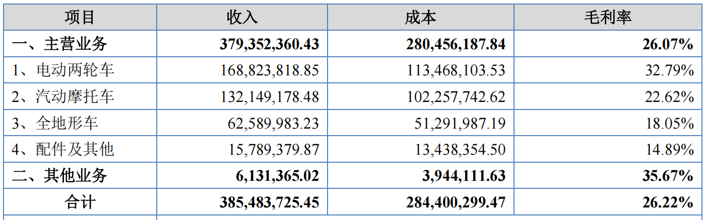 从目前的产品线来看,浙阿波罗主营电动两轮车、汽动摩托车和全地形车及其零配件研发、生产、销售。而据挂牌申报稿介绍,在摩托车行业内,浙阿波罗是率先布局越野摩托车产品的企业之一。
