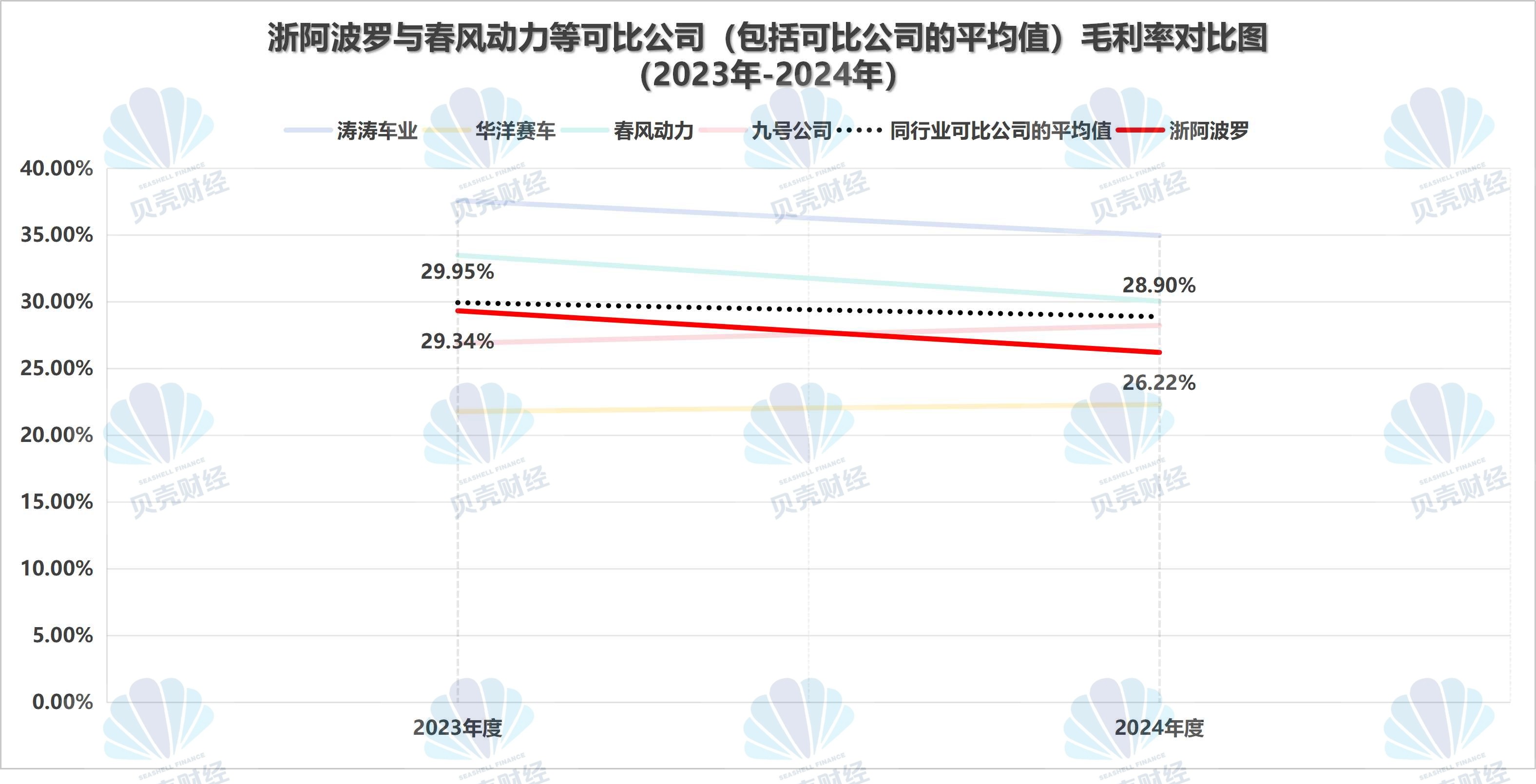 从行业毛利率来看,2023年,浙阿波罗同行业可比公司(例如春风动力)的综合毛利率平均水平约为30%,与浙阿波罗较为接近;2024年,浙阿波罗毛利率略低于同行业可比公司。据浙阿波罗介绍,这主要系其收入结构变动所致——“2024年浙阿波罗电动两轮车类小型车业务收入大幅上升,而此车型毛利率相对成人款略低,使得公司整体毛利率水平有所下降”。