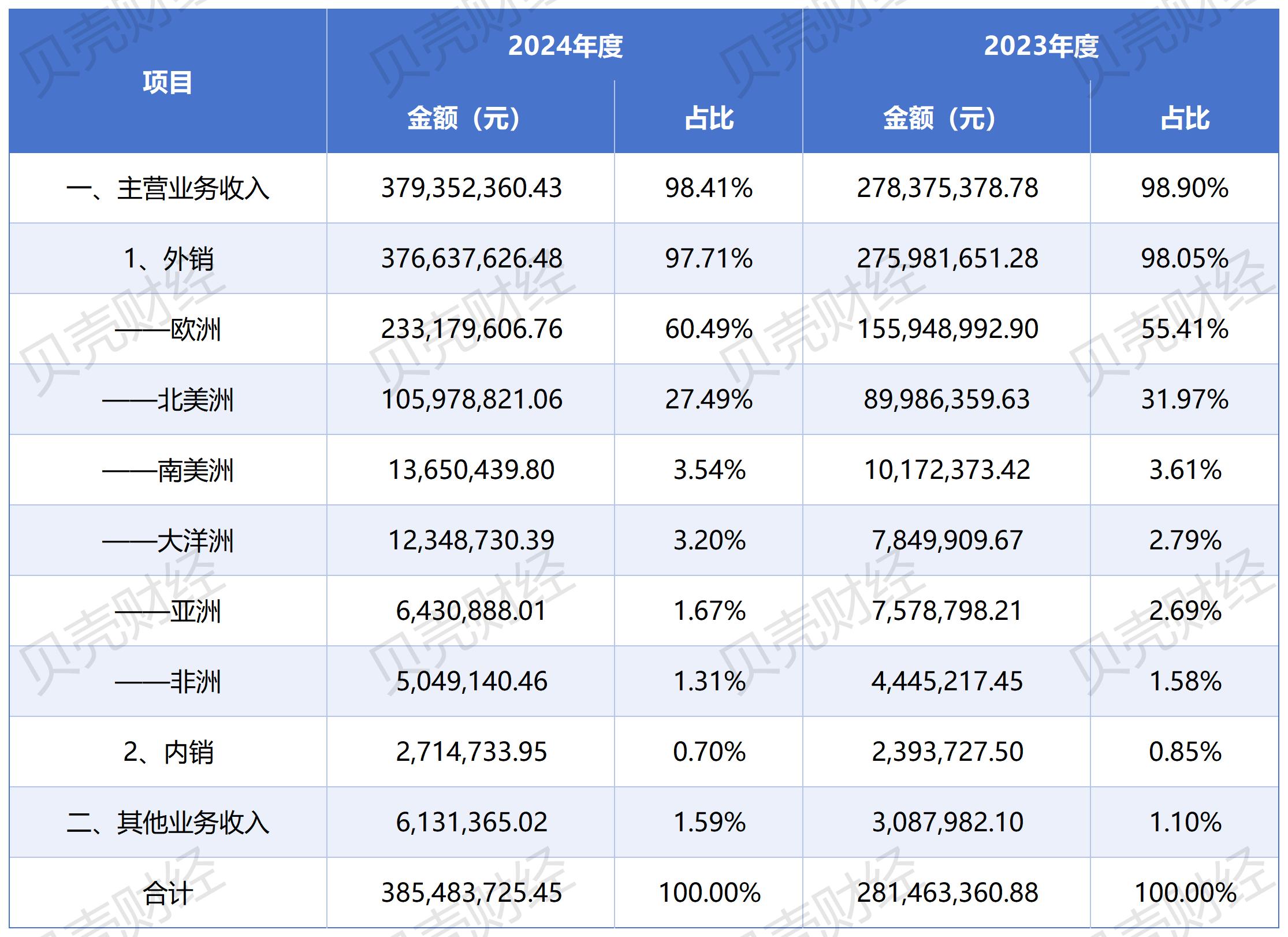 按地区分类,挂牌申报稿显示,2024年浙阿波罗境外收入占比高达97.71%,覆盖欧洲、北美洲、南美洲、大洋洲等国家和地区。为应对贸易摩擦可能给公司带来的不利影响,浙阿波罗表示,在积极开展美国业务的同时,加大了对欧洲市场的开拓力度。公司在欧洲地区的收入已从2023年的1.56亿元增长至2024年的2.33亿元,占比提升至60.49%,成为其境外的第一大市场。