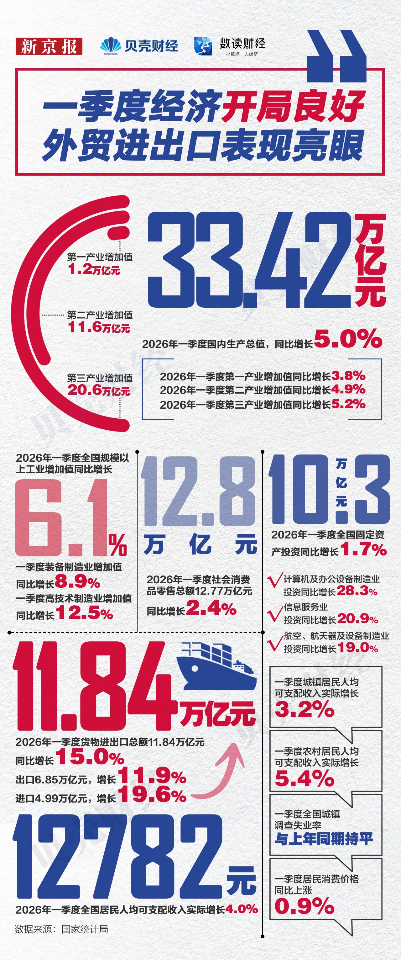 新京报贝壳财经记者梳理主要指标,带你速览一季度经济成绩单。