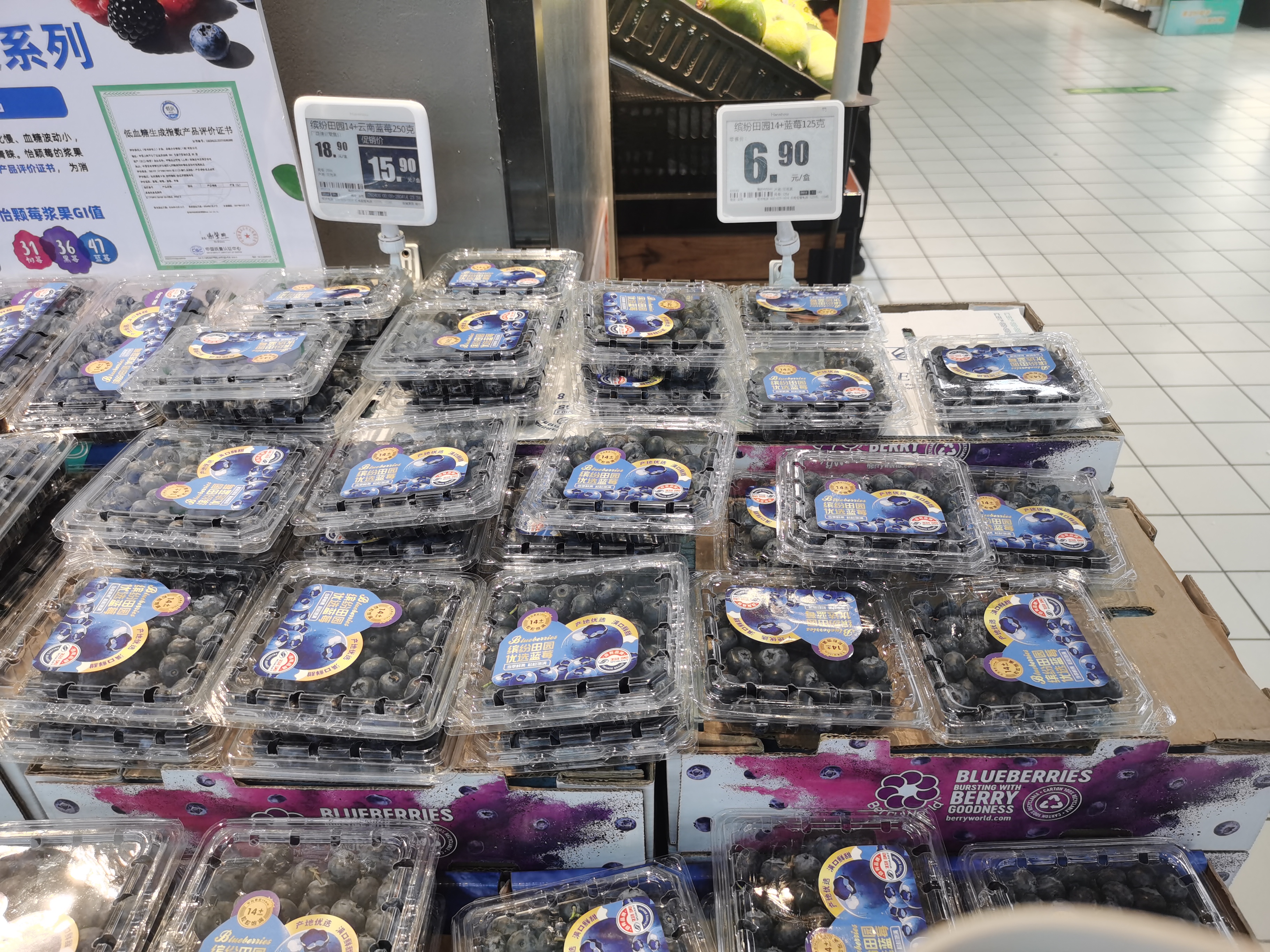 零售端的价格下滑并非个例,而是呈现全域蔓延的态势。新京报记者走访北京多家商超发现,与春节前夕相比,当前蓝莓价格降幅显著。在北京物美超市(泰和园店),工作人员向记者介绍,店内蓝莓价格已大幅回落,目前125克装(果径14mm)的蓝莓原价6.9元,优惠后仅售6.2元,折算下来约25元/斤,而春节前同款包装的价格是现在的两倍多。东城区一家社区团购水果店老板透露,普通中等果(果径14mm—16mm)蓝莓,春节前零售价还维持在30元/斤—40元/斤,如今已降至19.9元/斤,近乎腰斩。这一降价趋势在上海、杭州等地同样明显。据当地消费者反馈,春节期间,果径大于25mm的优质蓝莓,零售价一度飙升至150元/斤—170元/斤,堪称“水果贵族”;而进入4月初,同等规格的蓝莓价格已回落至45元/斤—60元/斤,降幅超五成,昔日高价鲜果已变得相对亲民。