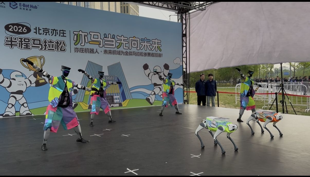 新京报贝壳财经讯(记者张冰)4月19日清晨,2026人形机器人半程马拉松赛在北京亦庄准时开跑。赛道边最先“燃”起来的,不是人类观众,而是一群机器人“氛围组”。在机器人大世界点位,一支由宇树机器人、加速进化机器人、云深处机器狗组成的啦啦队随着音乐律动,“一起热舞”。