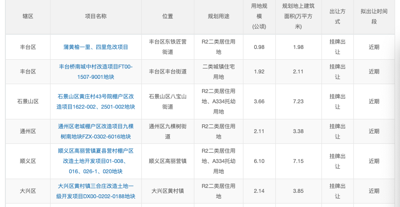 顺义区推出高丽营镇夏县营村棚户区改造土地开发项目01-008、016、026-1、020地块,位于顺义区高丽营镇,六环外,周边有南朗中休闲公园等生活配套设施。此外,大兴区推出黄村镇三合庄改造土地一级开发项目DX00-0202-0188地块,位于五环至六环之间,邻近地铁4号线大兴线清源路站。周边有新辰天地购物中心、中国中医科学院广安门医院(南区)、兴旺公园等生活配套设施。