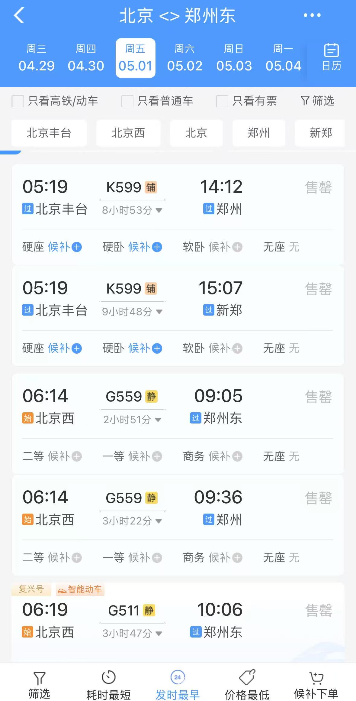12306App上5月1日北京到郑州的火车票售卖情况。