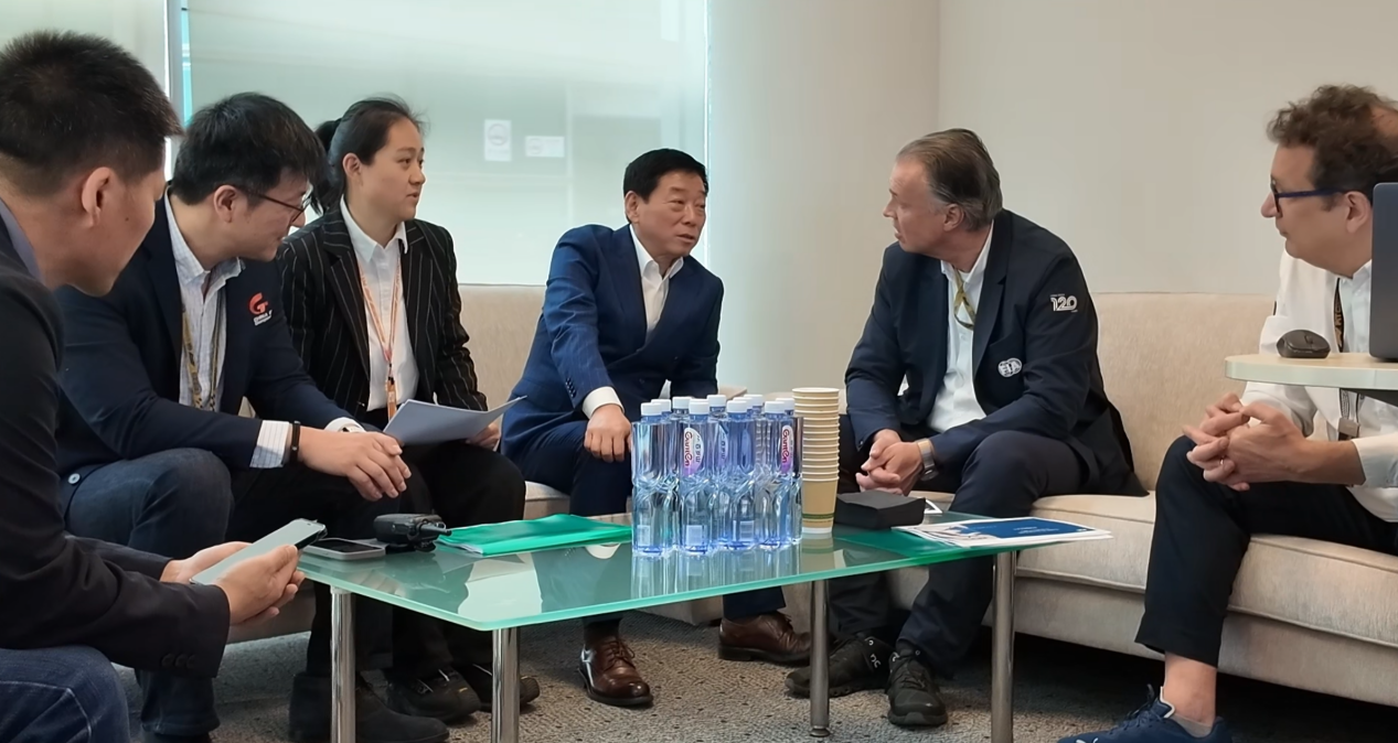 魏建军(左四)现身F1围场,和FIA高层深度交流。