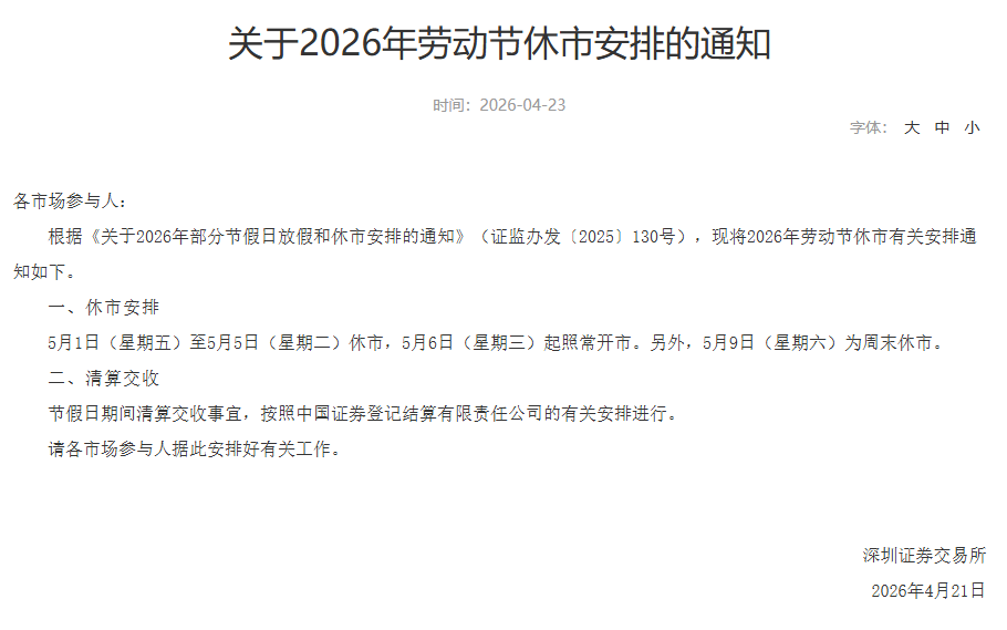 同日,深交所发布通知,根据《关于2026年部分节假日放假和休市安排的通知》(证监办发〔2025〕130号),现将2026年劳动节休市有关安排通知如下。