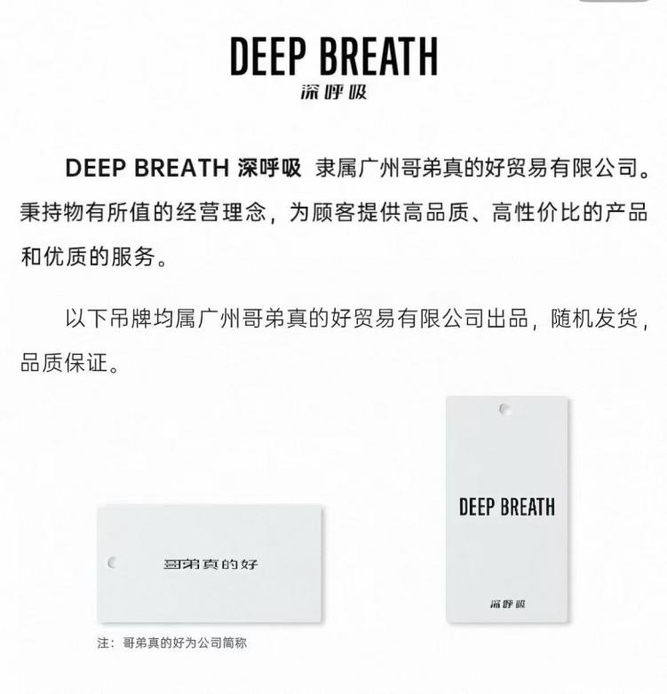 不过,页面提示显示,商品仍可能随机使用“哥弟真的好”或“深呼吸”两种吊牌,均由哥弟真的好公司出品,并注明“哥弟真的好”为该企业简称。