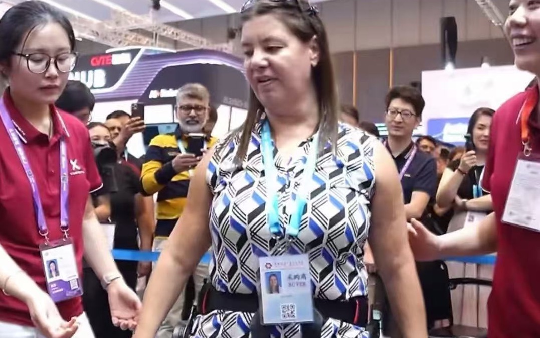 在广交会上,阿根廷肌无力患者玛丽亚在中国外骨骼机器人的辅助下站立行走。受访者供图