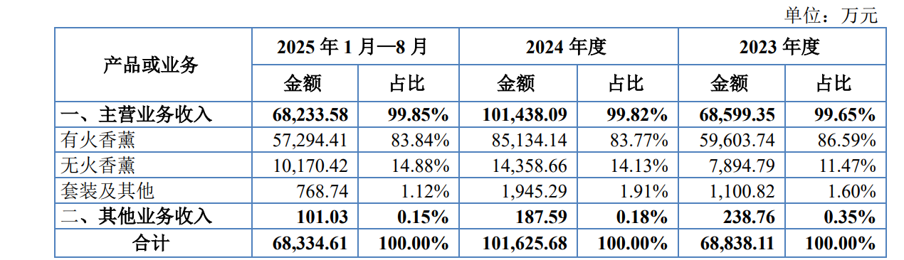将自身定位为“国内香薰领域领先的研发制造企业”的美通香薰,近年来业绩表现算得上亮眼。数据显示,2023年、2024年以及2025年1月-8月,该公司分别实现营业收入6.88亿元、10.16亿元以及6.83亿元,归属于申请挂牌公司股东的净利润分别约5324.31万元、7296.77万元、7090.55万元。