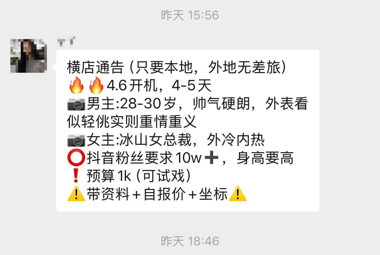 短剧的演员招募报价还在走低:男主戏,一天大概400-500元,这是2022年他刚入行时的市场价。他在通告群里还看到了包月的需求。“跟公司签约,一个月7000元至8000元,出工26天,一天拍12到14小时。”