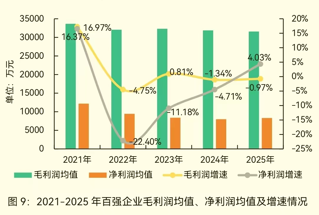 报告显示,2025年百强企业营收均值16.60亿元,增速与2024年基本持平,反映出营收增速正步入平稳通道。2025年,百强企业毛利润均值为3.16亿元,同比下降0.97%,降幅收窄。