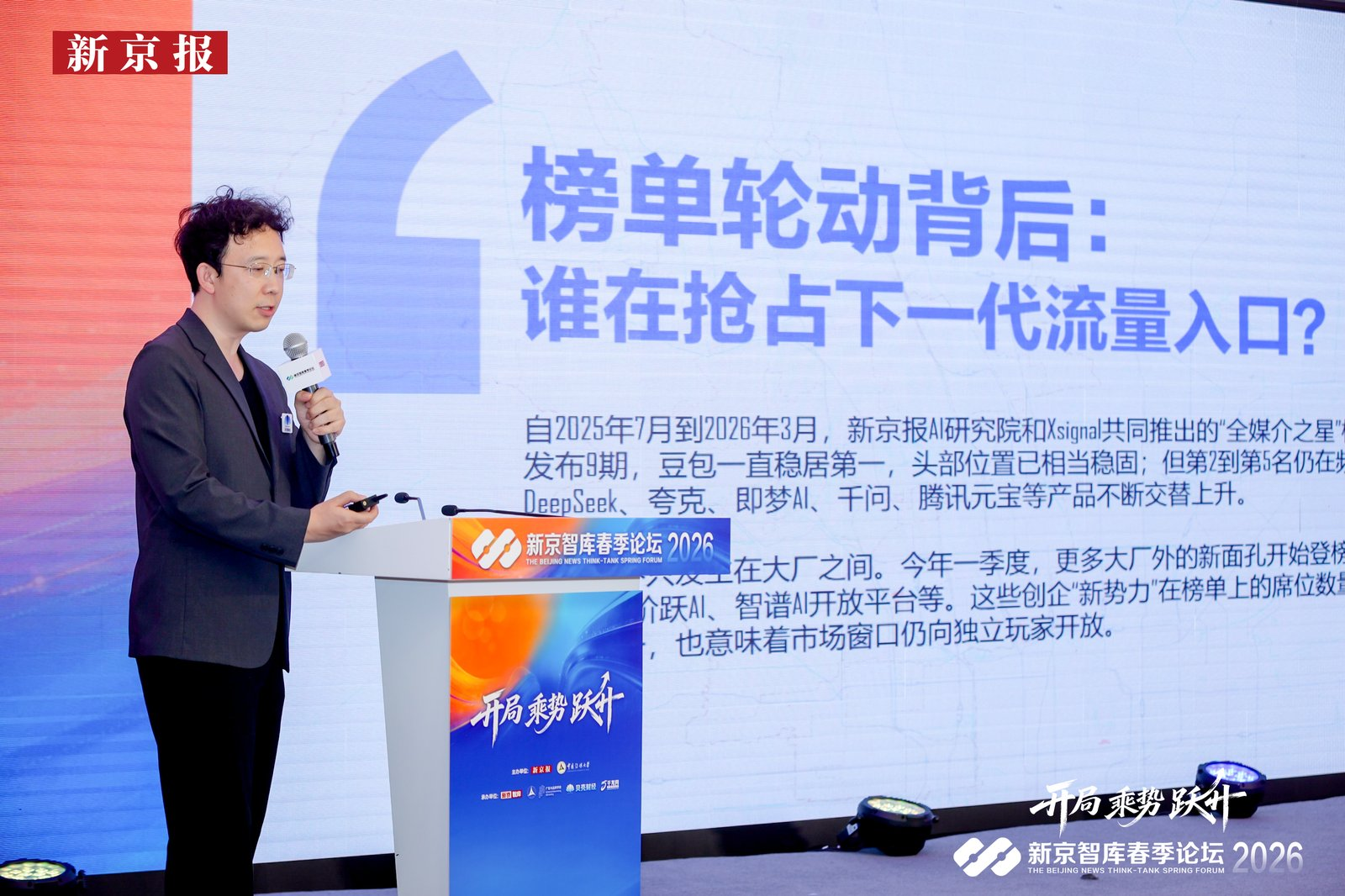 活动现场还首发了新京报AI研究院联合Xsignal制作的《2026春季AI应用竞争力报告》。报告从一季度海内外AI市场的共振与分化,国内大厂与AI创企对流量入口的争夺、AI红包大战等“拉新”手段后存留用户的情况、不同类型的AI应用的形态分工三方面对当前国内AI应用的月活、声量等数据进行了详细分析。
