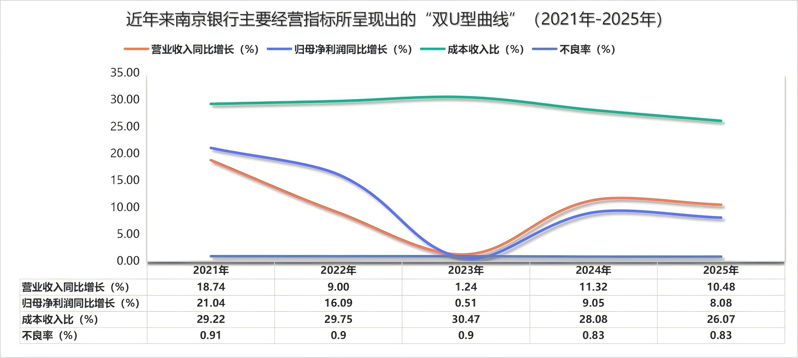 对此,南京银行2025年的回应是——实现营业收入555.42亿元,同比增长10.48%;归母净利润218.07亿元,同比增长8.08%;成本收入比同比下降2.01个百分点,不良贷款率维持在0.83%的较低水平。在银行业普遍面临息差收窄压力的背景下,这一“双U型曲线”格局尤为难得。