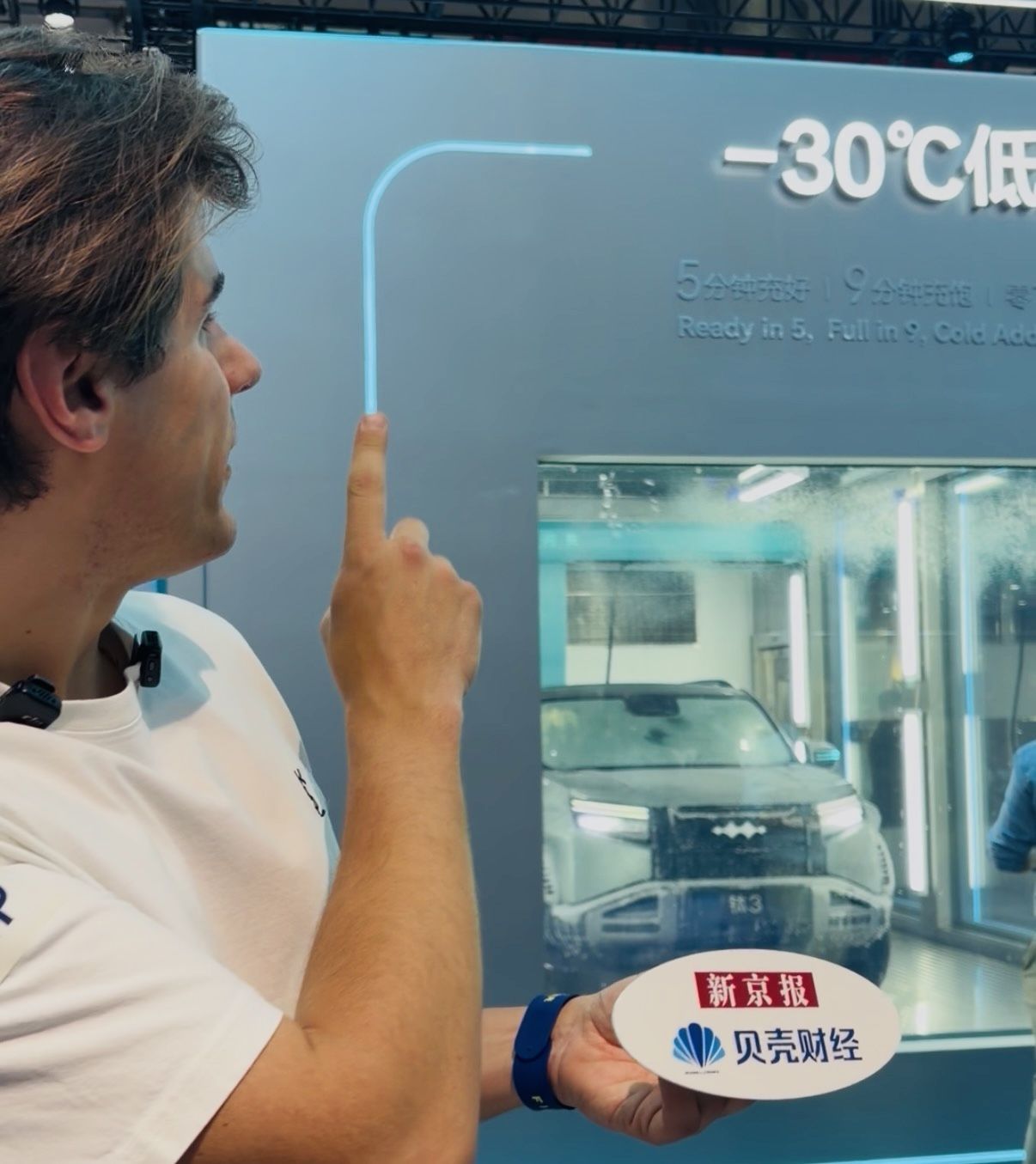 除了智能交互,三电技术的突破也令人侧目。比亚迪设置了-30℃低温仓,用于现场实测其电动汽车在极寒环境下的低温闪充性能。透过透明仓体,能直接看到里面停着一辆车,车身的漆面上已经结冰。许多外国人站在低温仓前感叹,“It's crazy!(这太疯狂了!)”