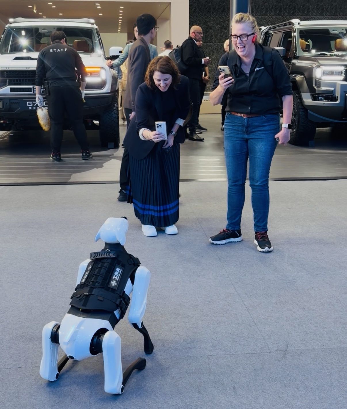 同样吸引眼球的,还有机器狗和机器人。尽管它们如今已经成为各大展会的常驻嘉宾,但对于外国人来说依旧新奇。北京车展的机器狗就引来许多外国人打卡拍照,一名外国女士弯下腰跟机器狗发出命令说,“Sit(坐)。”机器狗听话地坐下,她的伙伴在旁边给她和机器狗拍视频。