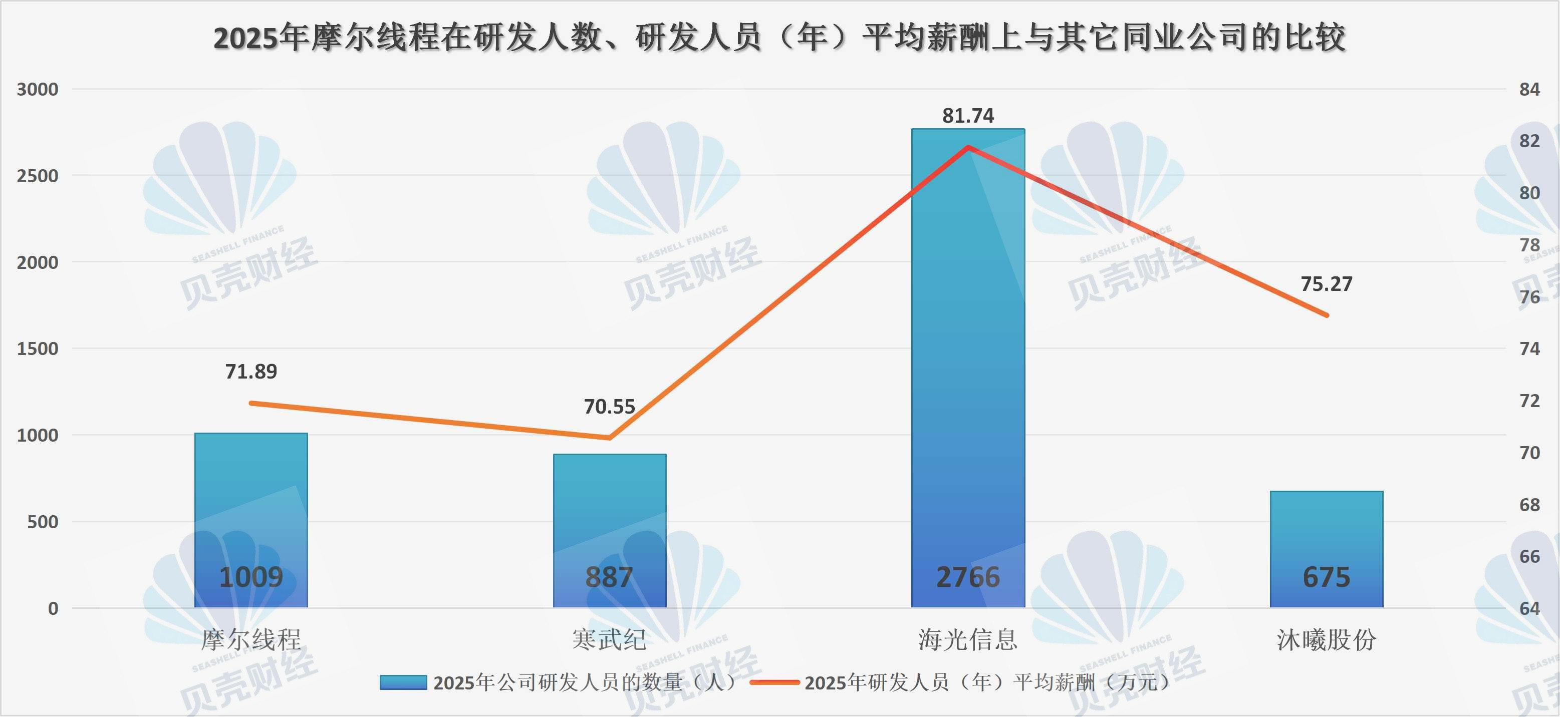 年报显示,2025年摩尔线程研发费用为13.05亿元,占营业收入比例达86.68%。截至2025年末,公司研发人员首次增至1009人,占到公司总员工人数的79.20%,超过同期的寒武纪和沐曦股份研发团队的人数;其2025年支付给研发人员的(年)平均薪酬为71.89万元,但与同业相比仍处于中间偏下的水平。