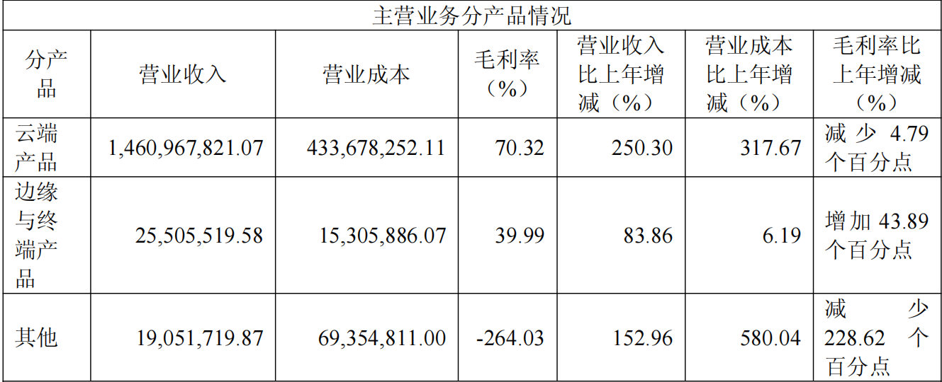 目前,摩尔线程主营业务分产品看,主要包括云端产品线、边缘与终端产品线及其他,2025年内各主营产品线均较上年同期实现增长。其中增幅最高的当数云端产品线——得益于人工智能产业蓬勃发展及市场对高性能GPU的强劲需求,该产品线2025年收入约为14.61亿元,较上年同期翻了两番,该产品线对总营收贡献率达97.08%。但值得关注的是,云端产品的营业成本也增长超3倍,同时毛利率下降了4.79个百分点。