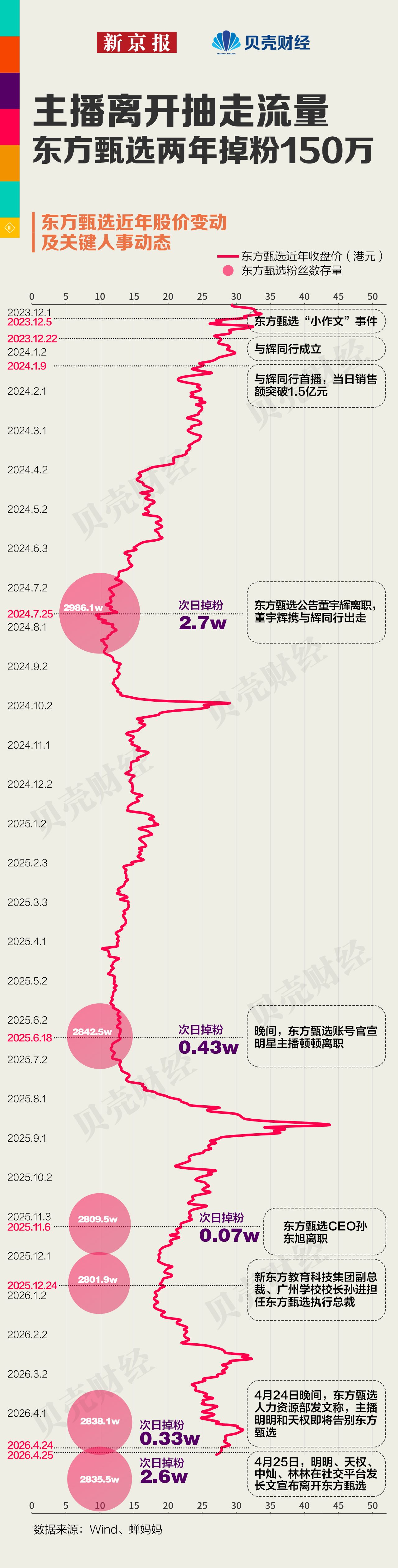 2025年6月顿顿合约到期后离开,次日股价下跌2.3%;同年11月CEO孙东旭卸任,次日股价下跌5.4%。2026年4月,随着明明、天权等四位核心主播集体告别,东方甄选股价在4月27日盘中一度下挫超8%,收盘时降幅为2.26%。