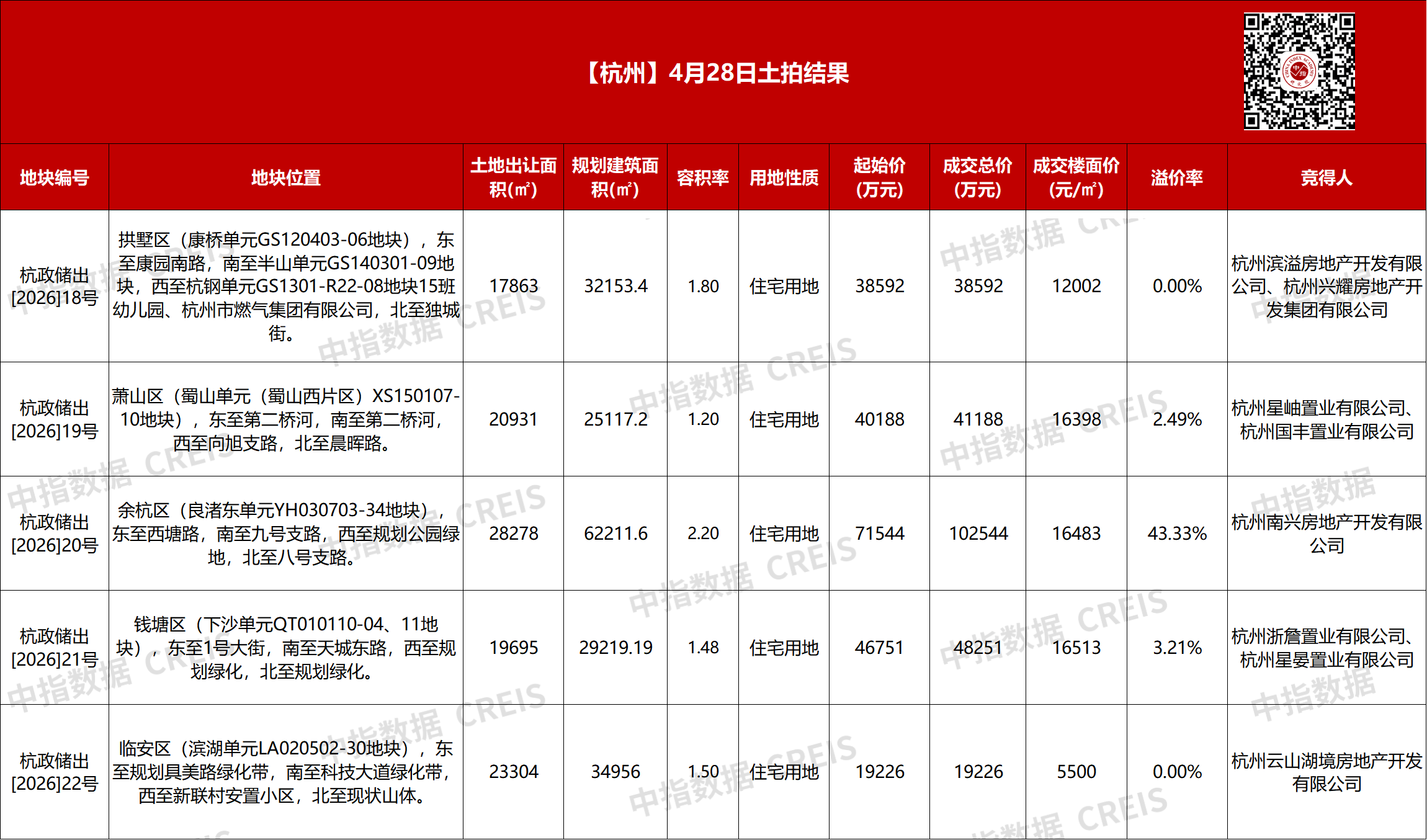 新京报贝壳财经讯 (记者徐倩)4月28日,杭州集中出让5宗宅地,总成交价24.98亿元,平均溢价率15.49%。