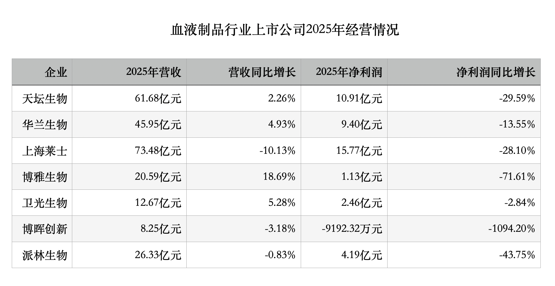在经历了数年的高速增长后,2025年,血液制品行业业绩集体承压。从财报来看,天坛生物、博雅生物、卫光生物、华兰生物4家企业2025年营收规模实现不同程度的同比增长,博雅生物以18.69%的营收增速领跑;多家企业增收不增利,上海莱士、派林生物和博晖创新2025年营收均出现下滑。净利润方面,7家行业内上市企业均出现不同程度的下滑。其中,天坛生物、上海莱士、华兰生物、博雅生物、派林生物5家企业的净利润规模均出现两位数的同比下滑;博晖创新则处于亏损状态。