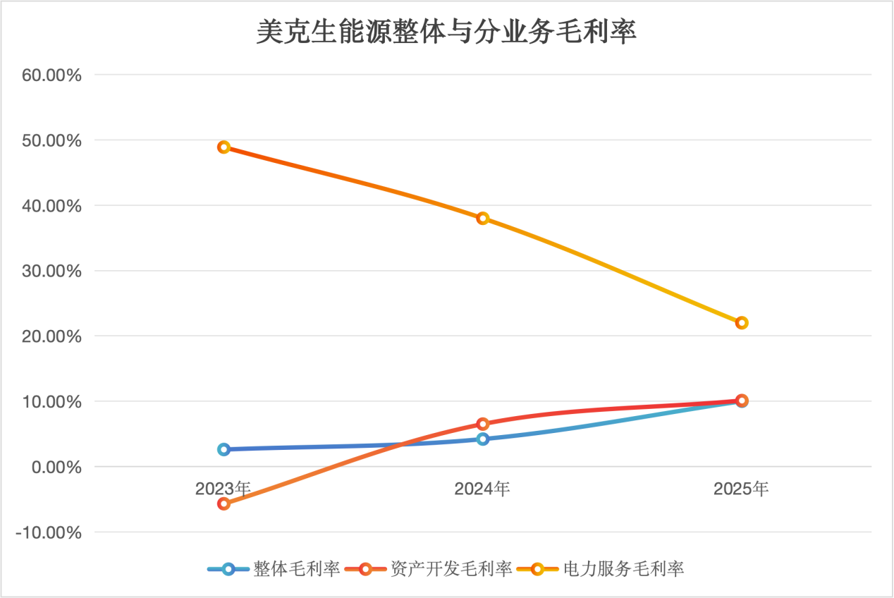 不过,贝壳财经记者注意到,美克生能源资产开发类业务的毛利率逐年上升,但电力服务业务的毛利率却呈显著下降趋势。而公司毛利率之所以逐年增长,仍然依赖于营收规模占绝对优势的资产开发业务。